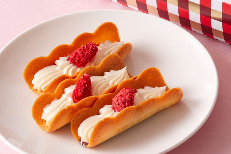 ショートケーキをイメージしてサックリと焼き上げたチュイールにホワイトチョコクリームとあまおういちごをのせた一口大のお菓子です。