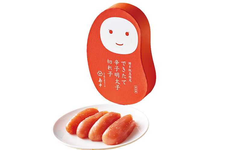 「島本」の明太子は優しめの味付け、素材の良さが際立ちます。中でも工場直送!できたて辛子明太子(切れ子)は漬けあがったばかりの明太子を工場から店舗へ直送。弾ける粒感や新鮮な風味は福岡だからこそのお品です。