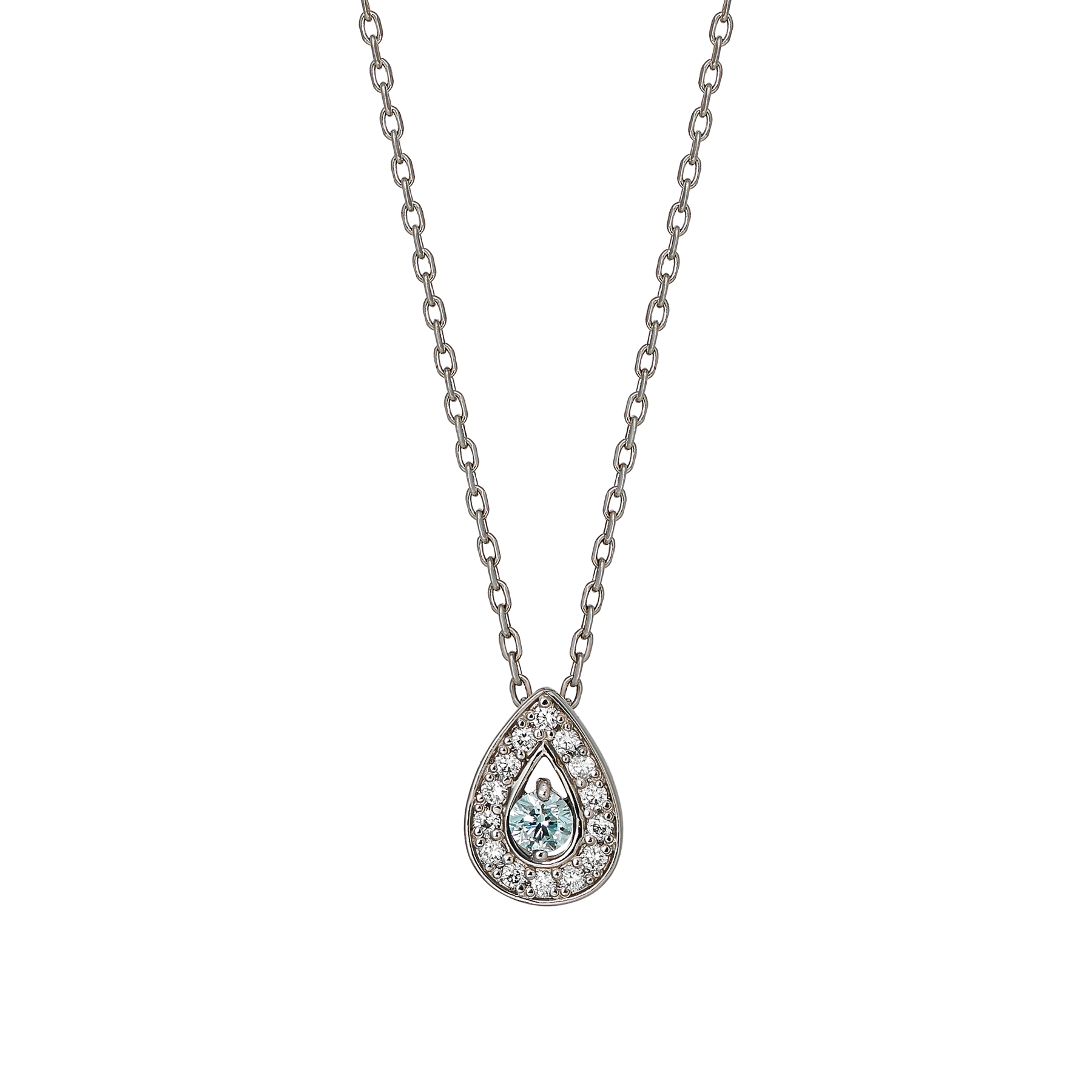 ダイヤモンドとプラチナが凛とした煌めきを放つエレガントなネックレス。上質なアイスブルーダイヤモンドを、メレダイヤを贅沢に敷き詰めたつゆ形のフレームで囲んだデザインです。センター石を一段高くセッティングすることでアイスブルーダイヤモンドが際立ち、輝きに奥行が感じられる仕上りに。