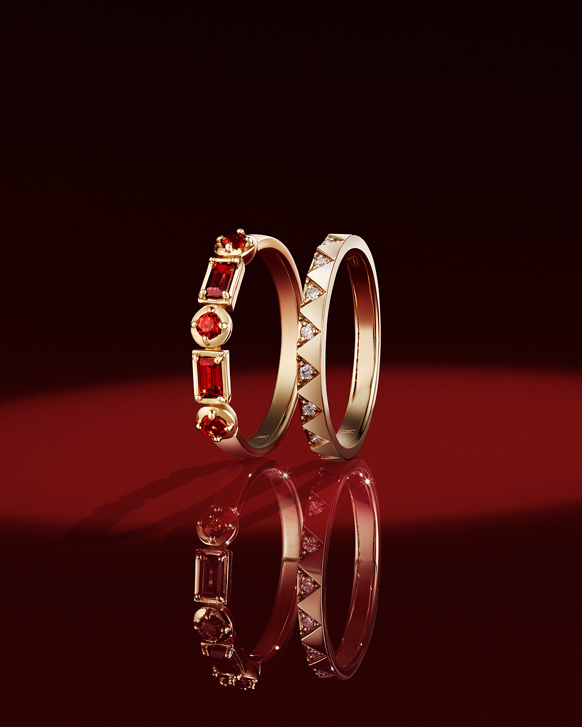 ガーネットとダイヤモンドの煌めきと、ゴールドのグラフィカルな模様がモダンなセットリング。2本を重ねてつけることで華やかな手元を演出し、 お手持ちのリングと組み合わせてつけることで、今までとは違う新たな表情を楽しめます。