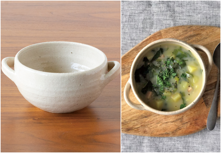 こちらも伊賀焼で、両方の持ち手が愛らしいスープカップ。特筆すべきは、その名の通り「直火OK」なこと。