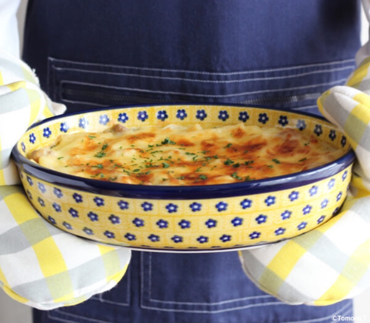 こちらのオーバル型は、グラタンやラザニアはもちろん、ローストチキンを盛り付けたり、パンをのせて食卓の真ん中に置いたりと、活躍すること間違いなしです。