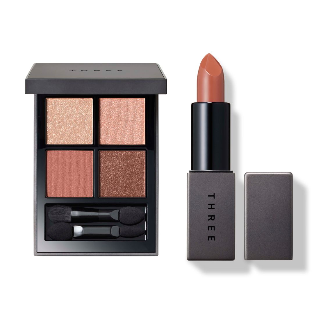フラワーティーのようなモーヴピンクのアイシャドウパレットは、パールとともに明るい輝きとソフトな目元へ。オレンジベージュとゴールド&ブルーの高輝度パールの深みを加えたリップを組み合わせて春の温もりを感じて。