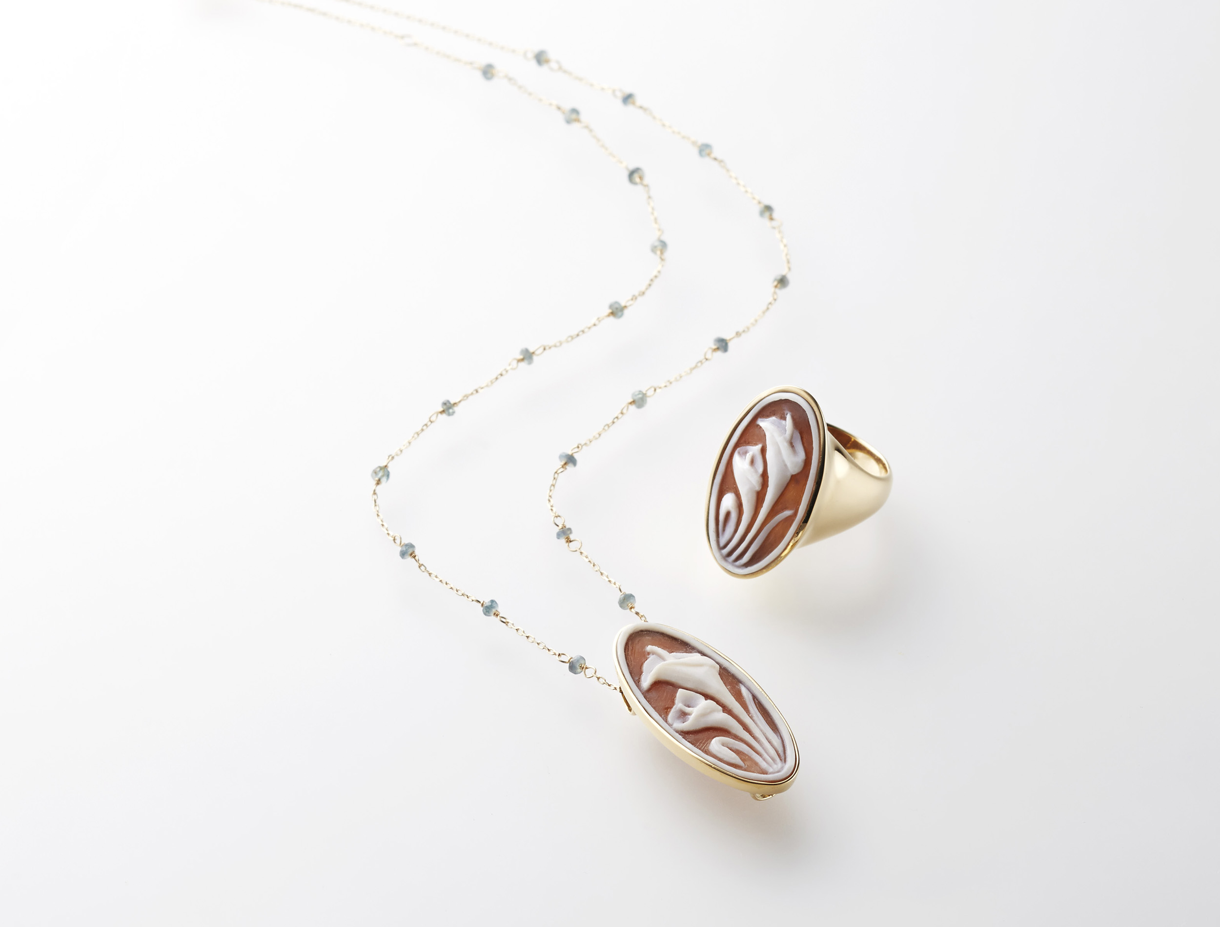 ブランドオリジナル図案のシェルカメオは、デザイナーと一人のカメオアーティストの出会いから始まりました。今回フラワーカメオコレクションから、ピンクカラーのコンクシェルを用いたシェルカメオのジュエリーと共にカラーストーンの一点ものジュエリーをご紹介いたします。