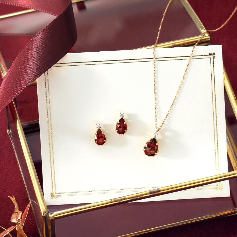 ガーベラの花束をイメージしたジュエリー。ガーネット(1月誕生石)は裏と表にカットを施し、内側から煌めきが湧き上がるような美しさが魅力です。花びらをイメージした枠が程よい輝きとクラシカルな印象をみせます。