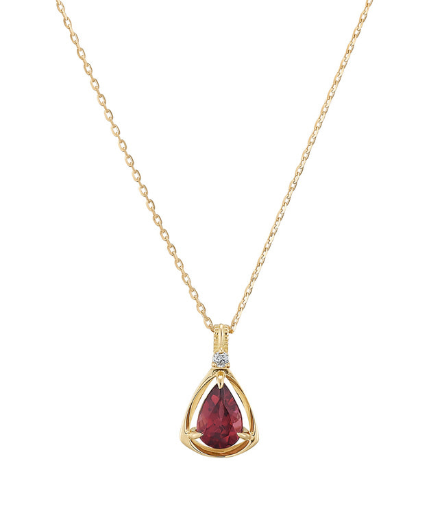 1月の誕生石・ガーネット(導きの灯り) 石言葉は「真実」。ガーネットをメレダイヤモンドで取り巻いた、ベーシックでさりげなくエレガントなデザインのネックレス。「真実」などの石言葉を持つガーネットは真の友情や、永遠の愛情を引き寄せる力があると言われています。