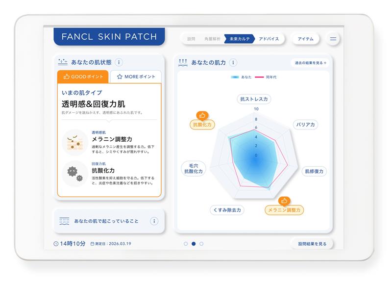 「ファンケル」スキンパッチは、角層の形やタンパク質から“今の肌状態”と“未来の肌リスク”が同時に分かるAI角層解析です。