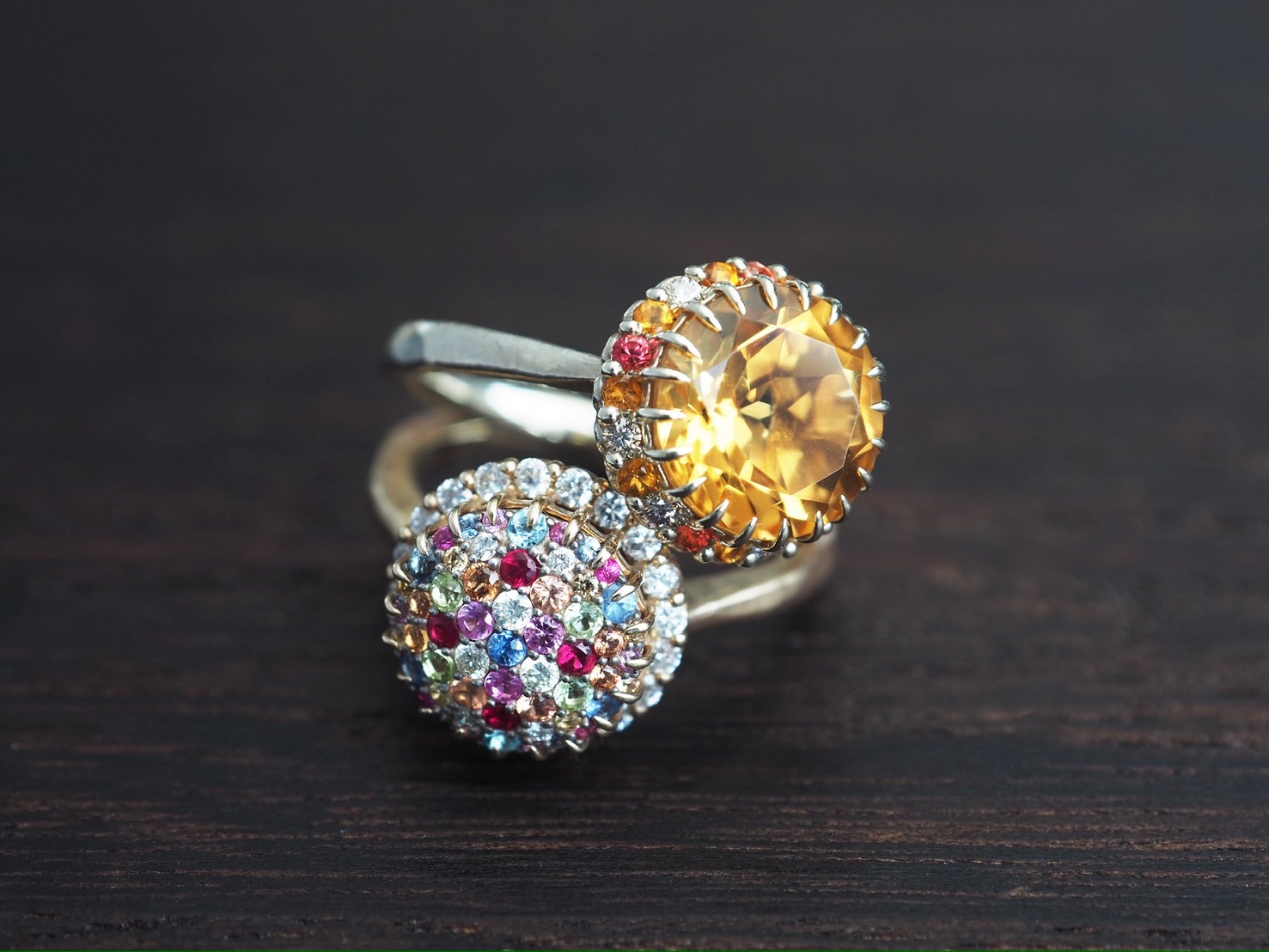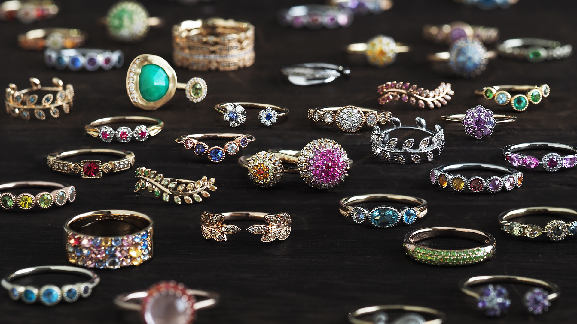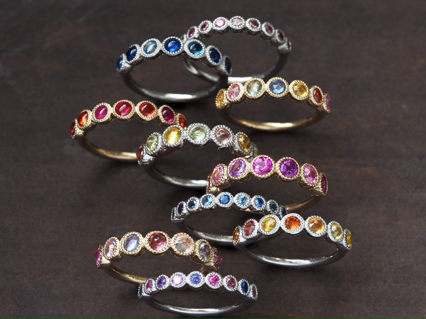 カラーストーンやダイヤモンドの彩りに、ミルの繊細な輝きが寄り添い、静かな美しさをたたえています。