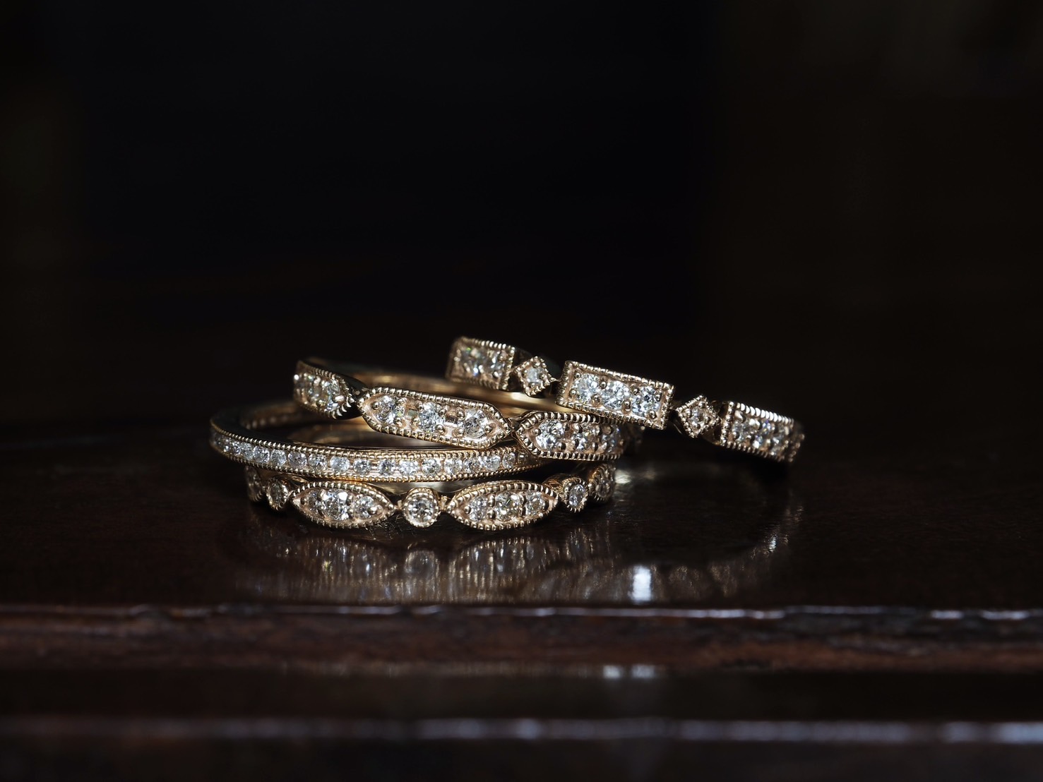 同じシリーズのストレートデザインと重ねても、ミル打ちが施されている指環と重ねても…。