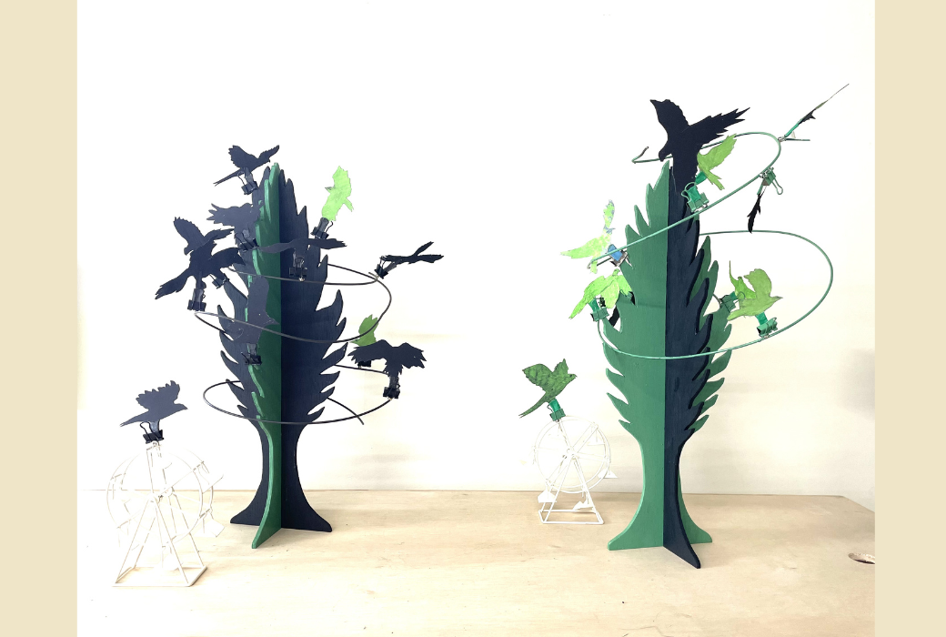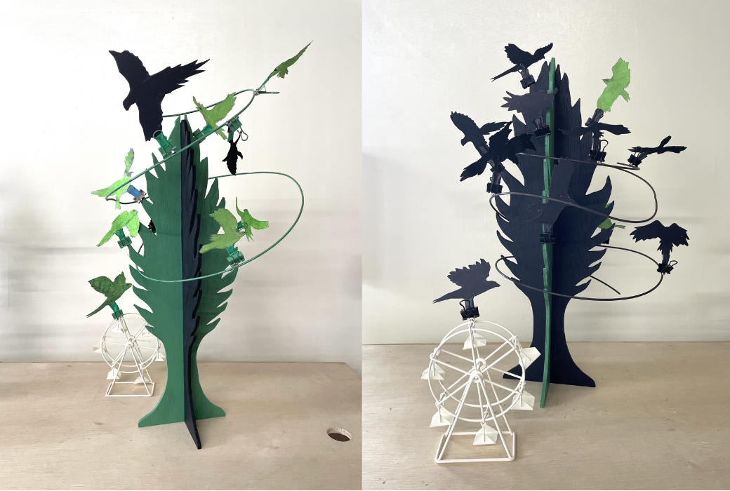 近年は、距離によって変化する認識に関心を持っています。空を飛んでいるのはカラスなのかオウムなのか、グリーンなのか黒なのか。今いる位置によって、何が見えるのか。そうしたことを考えながら、作品の前で少しだけ立ち止まっていただけたら幸いです。