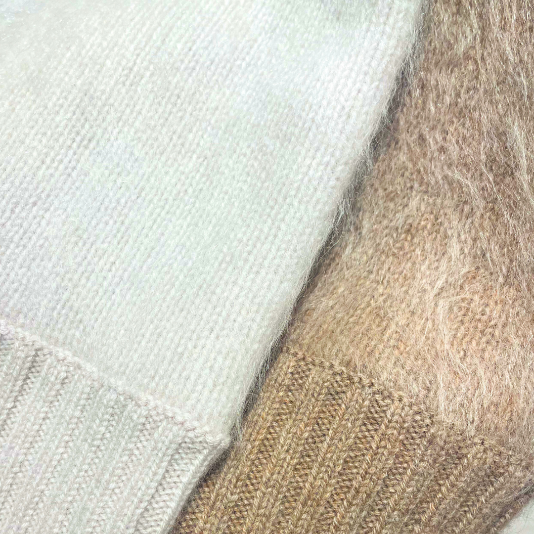 3色のウールモヘアのブラッシュド素材を使用したジャカード織のニット。表面をブラッシングして仕上げることでふわりとした柔らかさや光沢感を表現し、まるで黄金に輝く夕暮れの空のように、闇から光への移ろいを見事に体現。