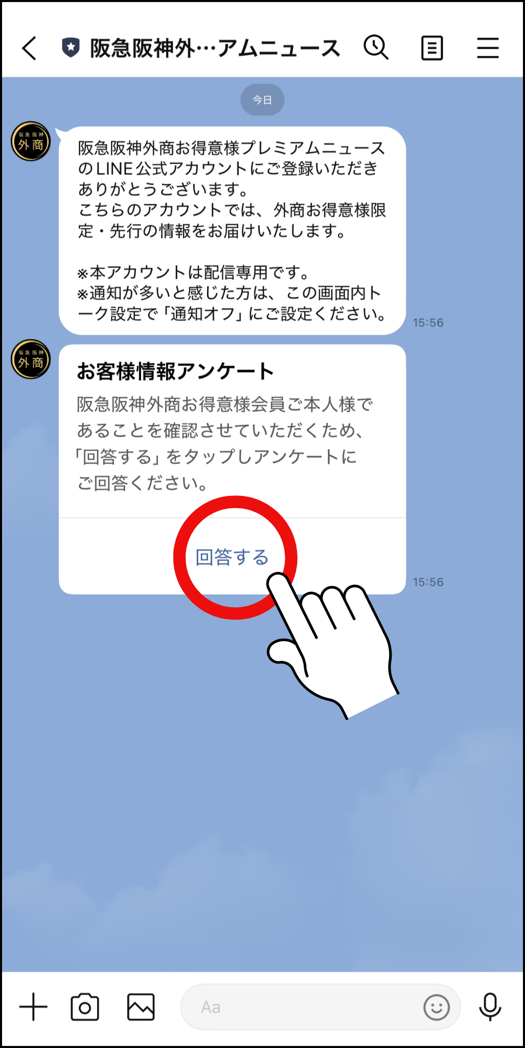 ④「阪急阪神お得意様カード PREMIUM」をお手元にご用意の上、メッセージで送られてくるアンケートの“回答する”をタップし、お客様情報をご入力ください。