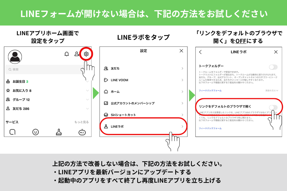 LINEフォームが開けない場合、添付画像内の方法をお試しいただきますようお願いいたします。