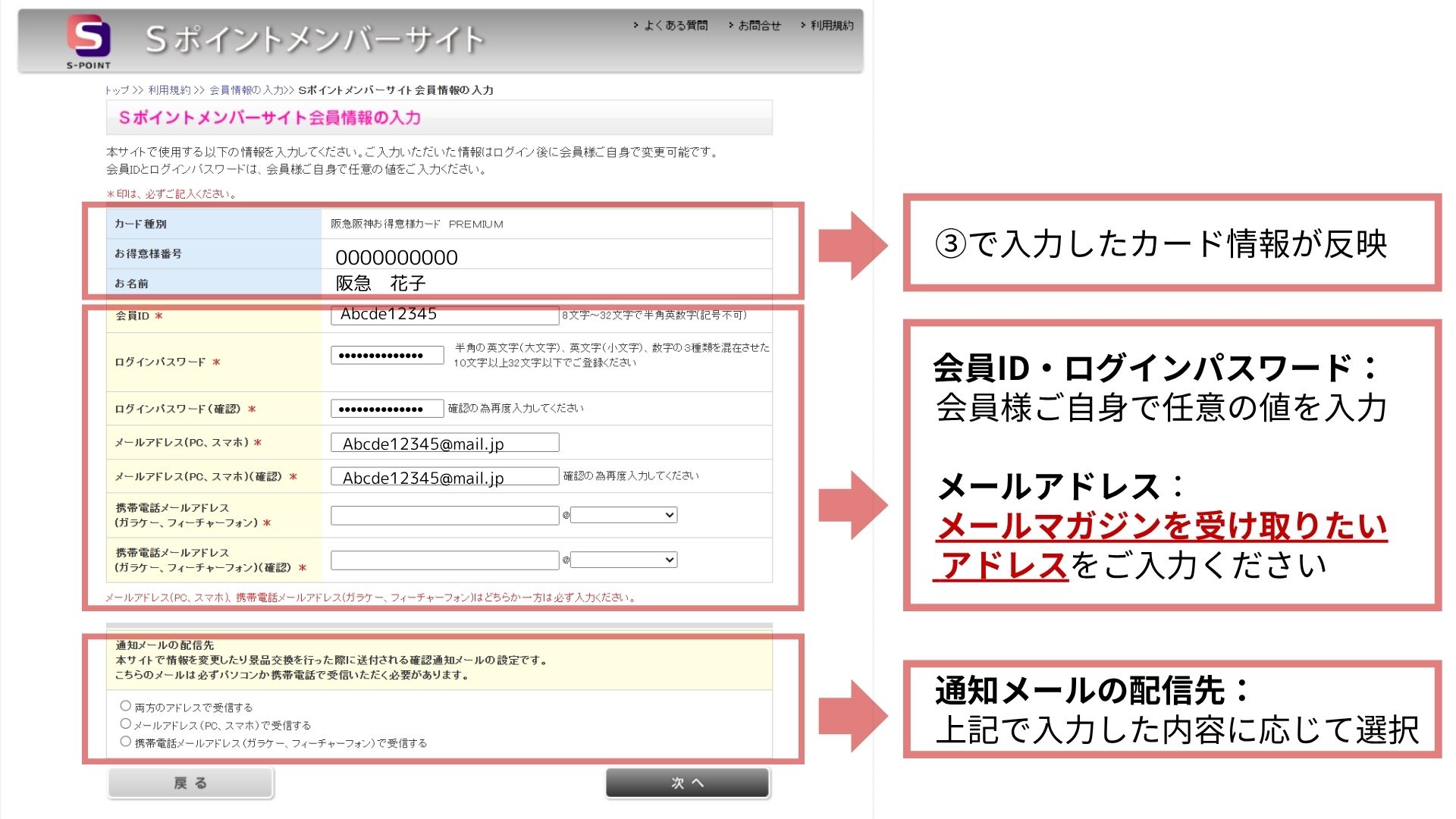 ④Sポイントメンバーサイト会員情報の入力:必要事項を入力し、次へをクリック