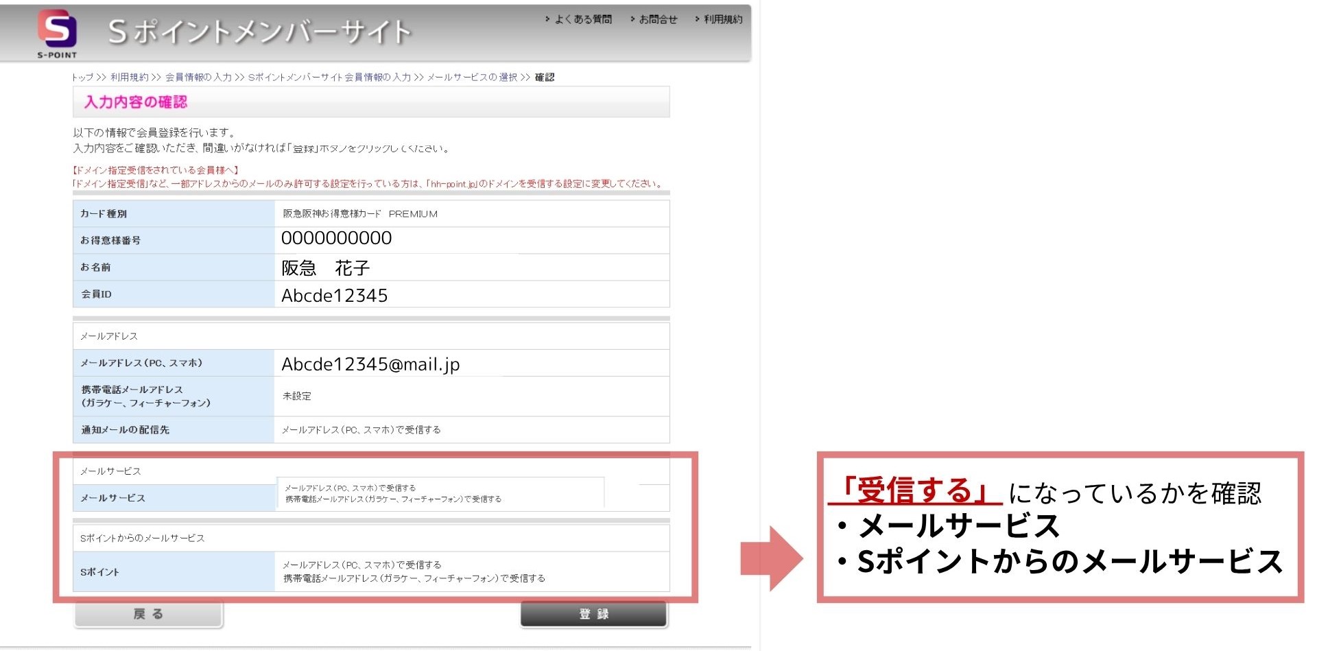 ⑤メールサービスの選択:STACIAからのメールサービス・Sポイントからのメールサービスの両方の欄に☑を入れ、確認をクリック