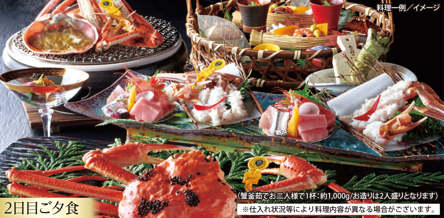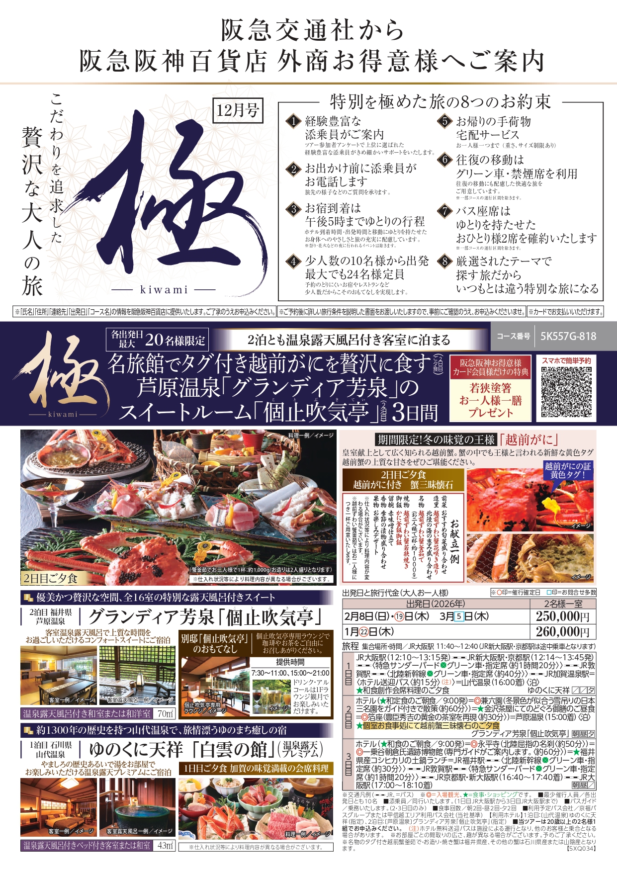 極みポイント 【外商お得意様限定】若狭塗箸 お一人様一膳 プレゼント ▶2泊とも温泉露天風呂付き客室に泊まり、冬の味覚の王様「タグ付き越前がに」を贅沢にご堪能!(2日目ご夕食) ▶1泊目は北陸・加賀温泉で約1300年の歴史を持つ山代温泉でゆのまち風情を楽しめる温泉旅館にご宿泊。湯量豊富な2つの源泉をお楽しみください。 ▶2泊目は芦原温泉「グランディア芳泉」全16室の特別なスイート別邸「個止吹気亭」にご宿泊。個止吹気亭専用個室お食事処にて越前がにをご用意。 |