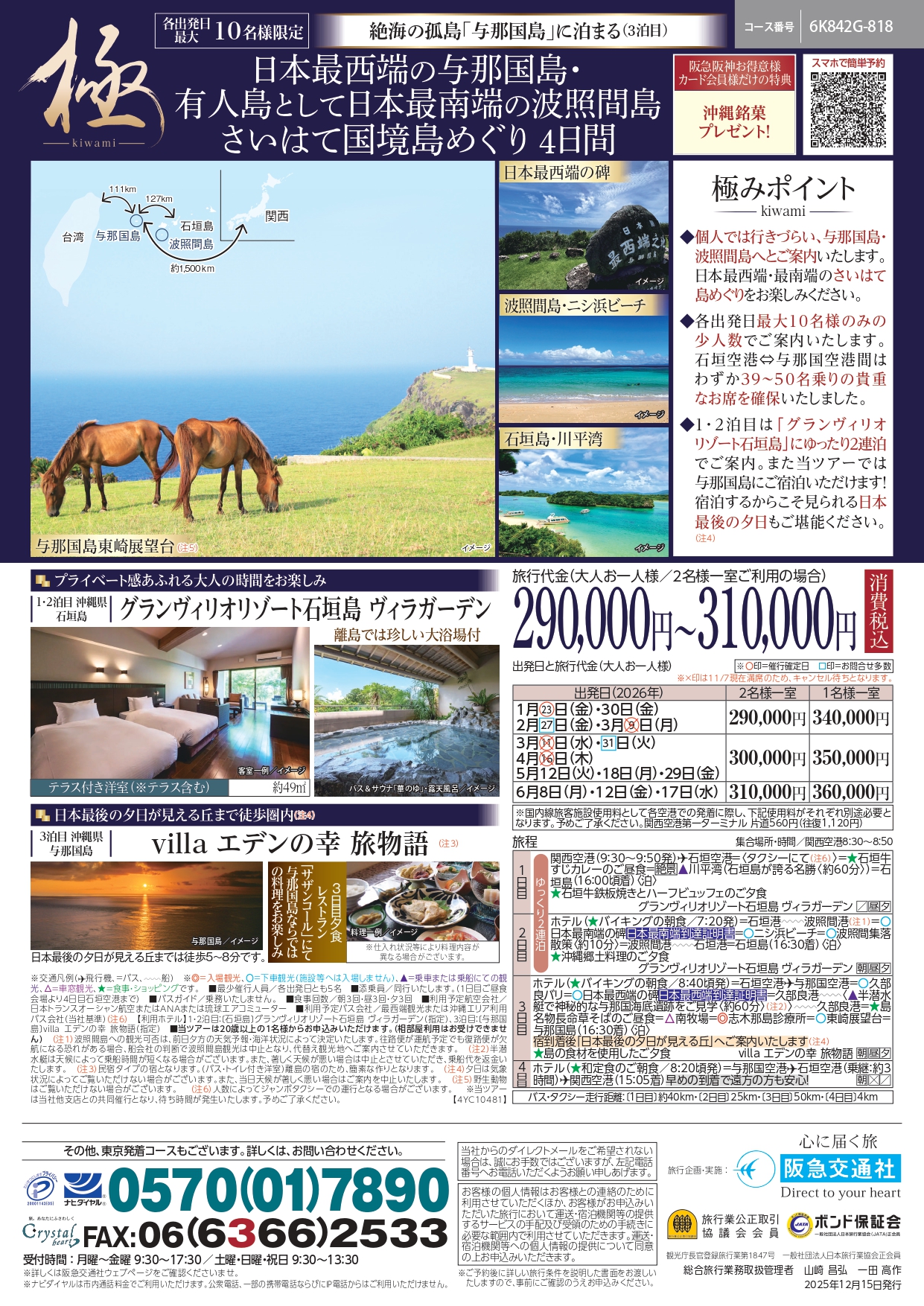 極みポイント 【外商お得意様限定】沖縄銘菓をプレゼント ▶個人では行きづらい、与那国島・波照間島へとご案内いたします。日本最西端・最南端のさいはて島めぐりをお楽しみください。 ▶各出発日最大10名様のみの少人数でご案内いたします。石垣空港⇔与那国空港間はわずか39~50名海苔の貴重なお席を確保いたしました。 ▶1・2泊目は「グランヴィリオリゾート石垣島」にゆったり2連泊でご案内。また当ツアーでは与那国島にご宿泊いただけます!宿泊するからこそ見られる日本最後の夕日もご堪能ください。 |