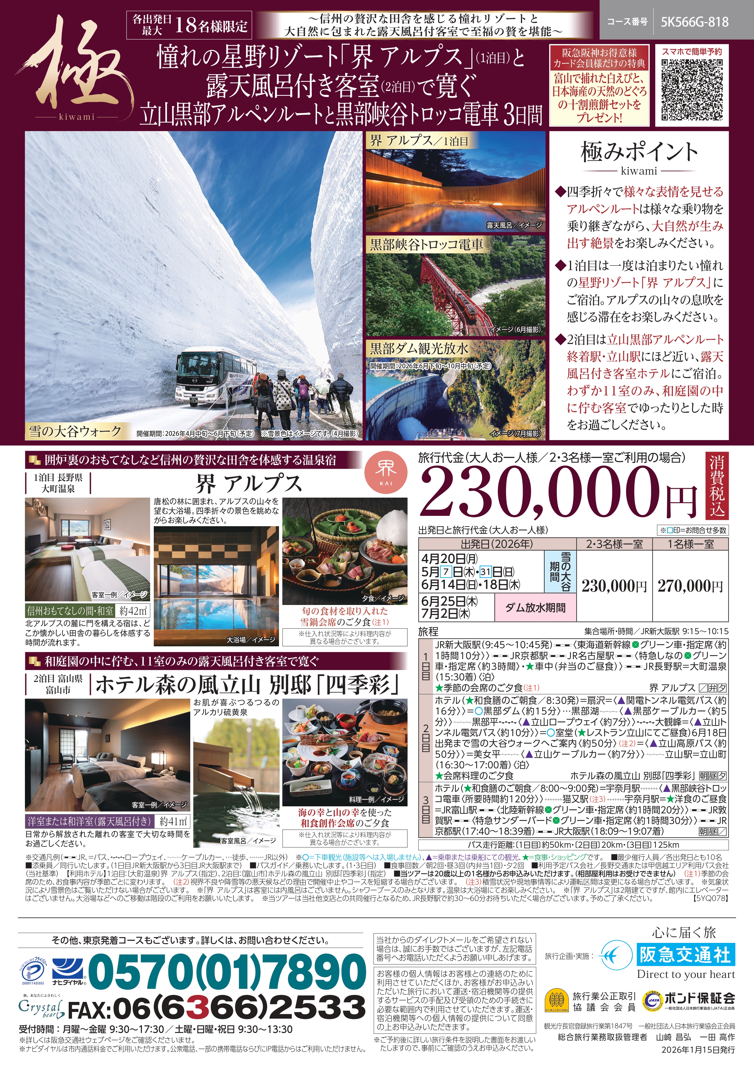 憧れの星野リゾート「界 アルプス」(1泊目) と温泉露天風呂付き客室 (2泊目) で寛ぐ立山黒部アルペンルートと黒部峡谷トロッコ電車 3日間