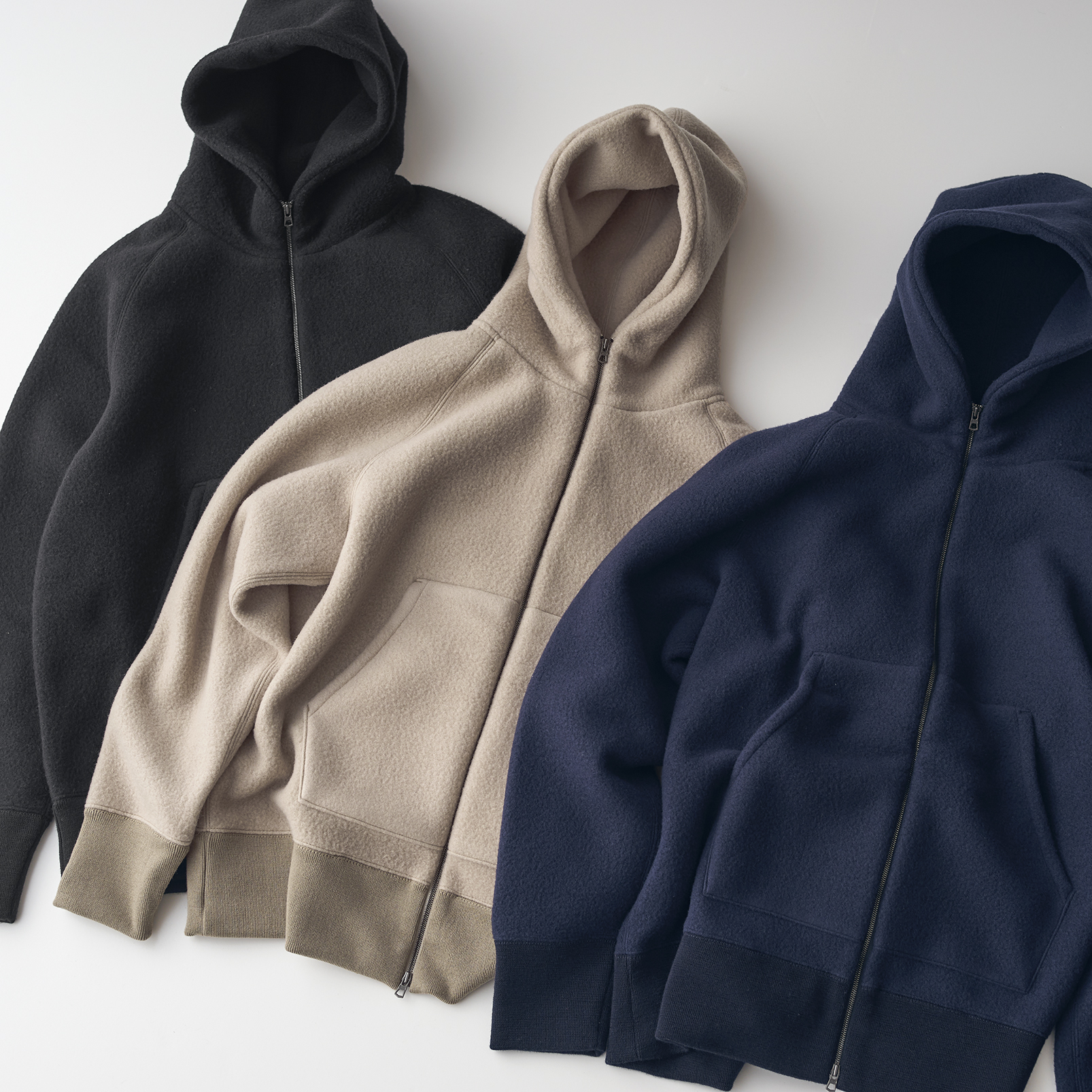 「CURLY&Co.」では定番のジップアップパーカのデザインに、軽量でふかふかとした絶妙な肌触りのウール起毛ダンボールニットを落とし込んだアイテム。