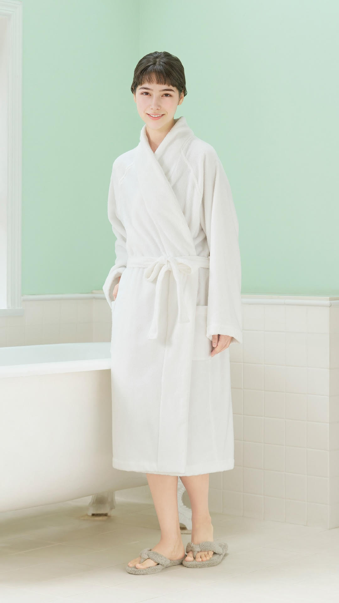 入浴後の肌をやさしく包み込むバスローブです。さっと羽織るだけで水分を落ち着かせ、肌に触れる際の摩擦に配慮した設計です。生地は、毛羽立ちにくいよう工夫がされており、気持ちの良い着心地。細幅の襟を立てると首元まで覆うことができ、入浴後のリラックスタイムをサポートします。