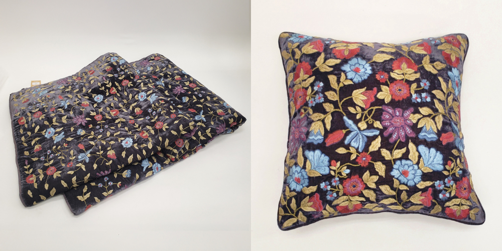 美しい花々が咲き誇るような刺繍は、暗くなりがちな冬の室内を明るく彩り、大切な方への贈り物としても喜ばれることでしょう。