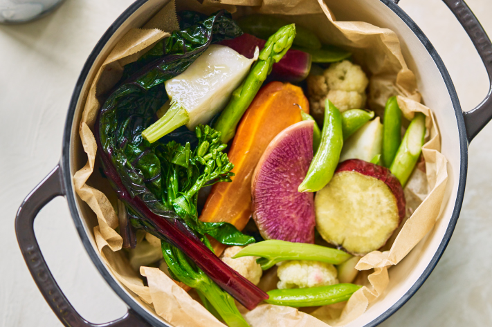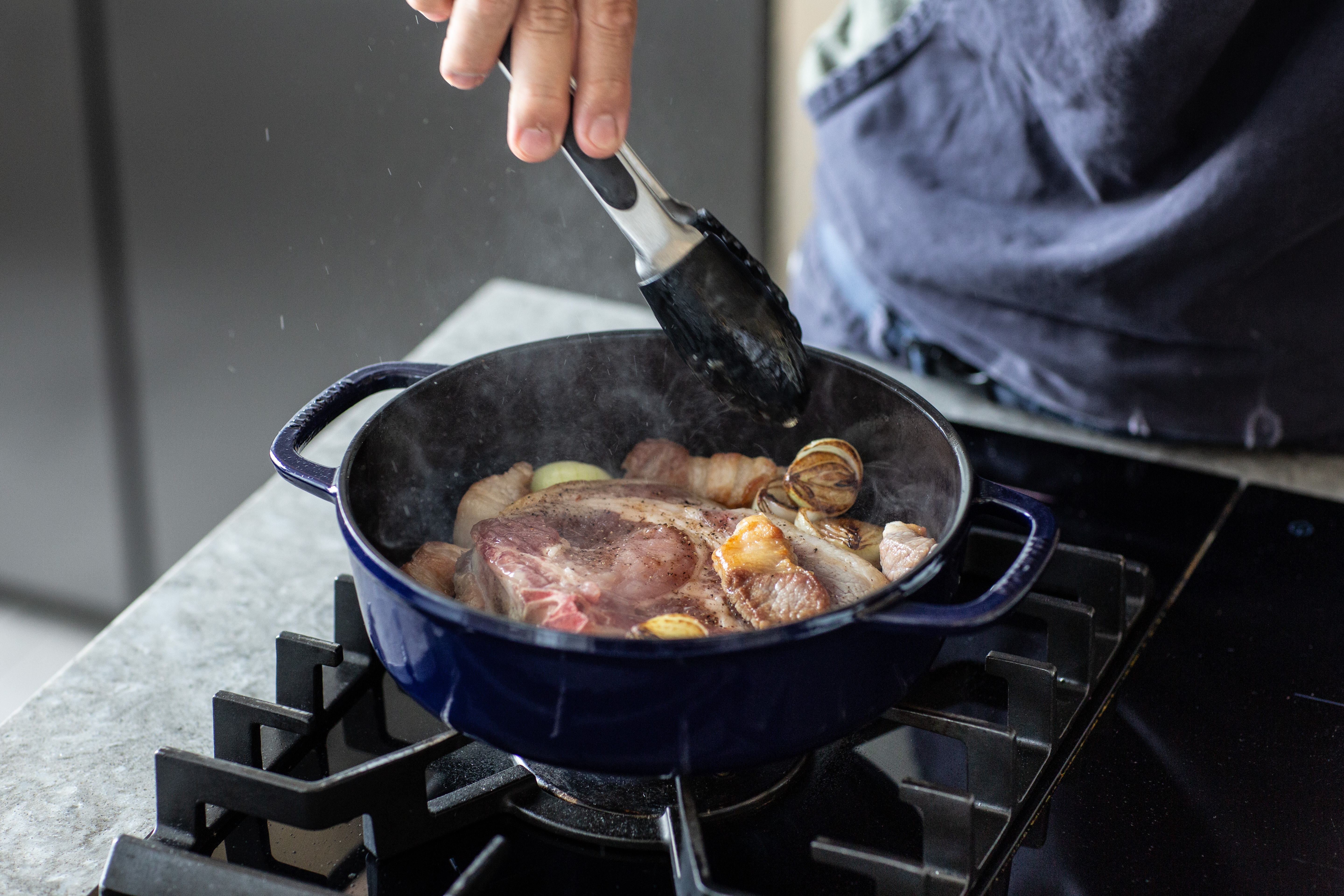 ホームパーティーの準備負担を減らす、浅型ならではの新しい調理法「無水ベイク」。鍋で1分焼き付けた後、フタをして短時間蒸し上げるだけの簡単調理です。これにより、野菜本来の豊かな風味や香ばしさが引き立ち、塊肉の焼き付けや炒め調理にも適しています。調理の時短をサポートし、ゲストを迎えるゆとりを生み出します。