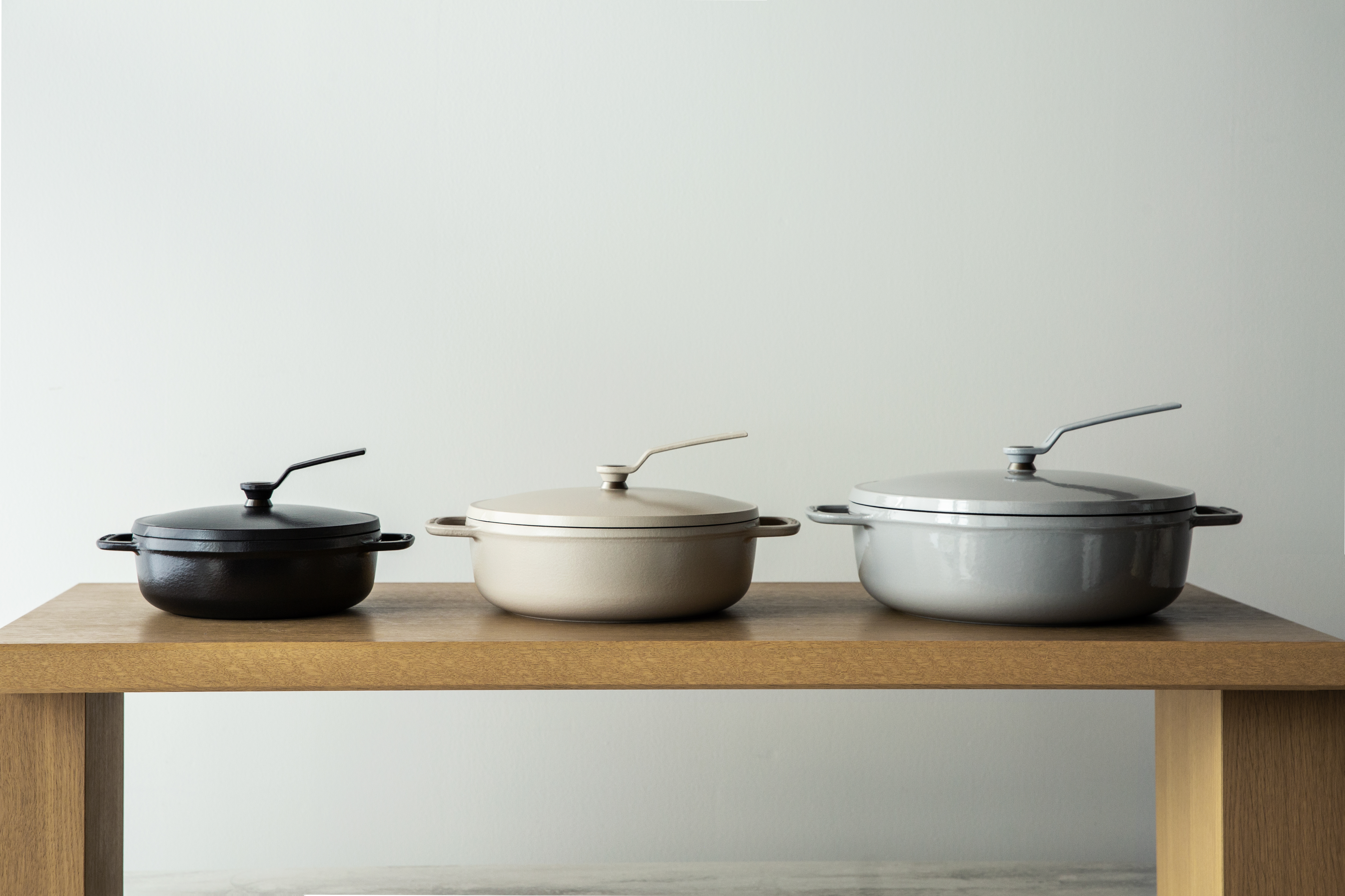 その美しいデザインで食卓の主役を飾る、鋳物ホーロー鍋の浅型シリーズです。盛り付け皿のような浅型は、料理を一層引き立てます。フタが自立するセルフスタンディングリッド仕様のため、食卓でもスマートに扱えます。