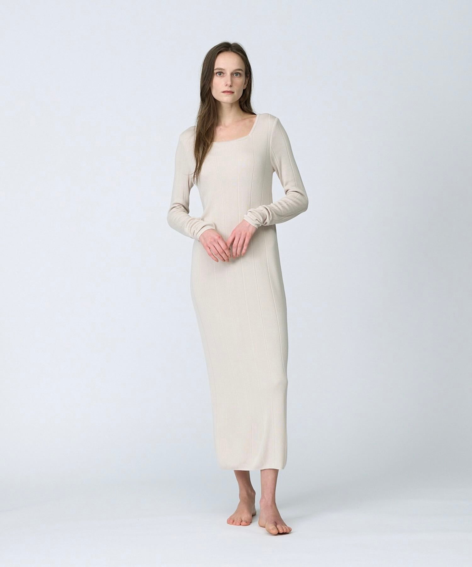 シルクをブレンドした、伸縮性のあるリブニットワンピースはなめらかな肌ざわりが特長です。品のあるデザインで、ご自宅でのホリデーシーズンを心地よく彩ります。1枚で着用できるカップ付き仕様のため、インナーなしですっきりと着こなせます。ご自身へのご褒美や、冬の贈り物としてもおすすめです。