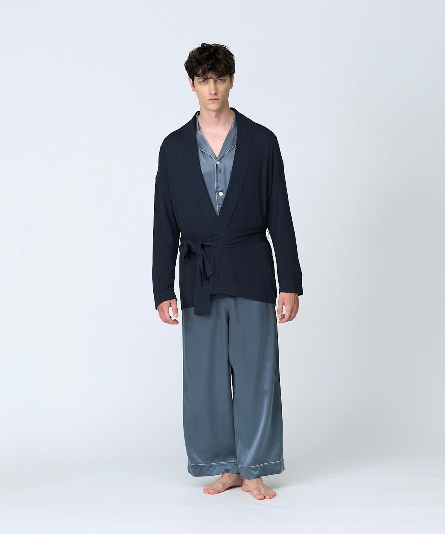 シルクをブレンドした、なめらかな肌触りのローブカーディガン。肌寒い季節に、パジャマの上から羽織るものとして、シルクパジャマに合うよう丈感やデザインが考えられています。
