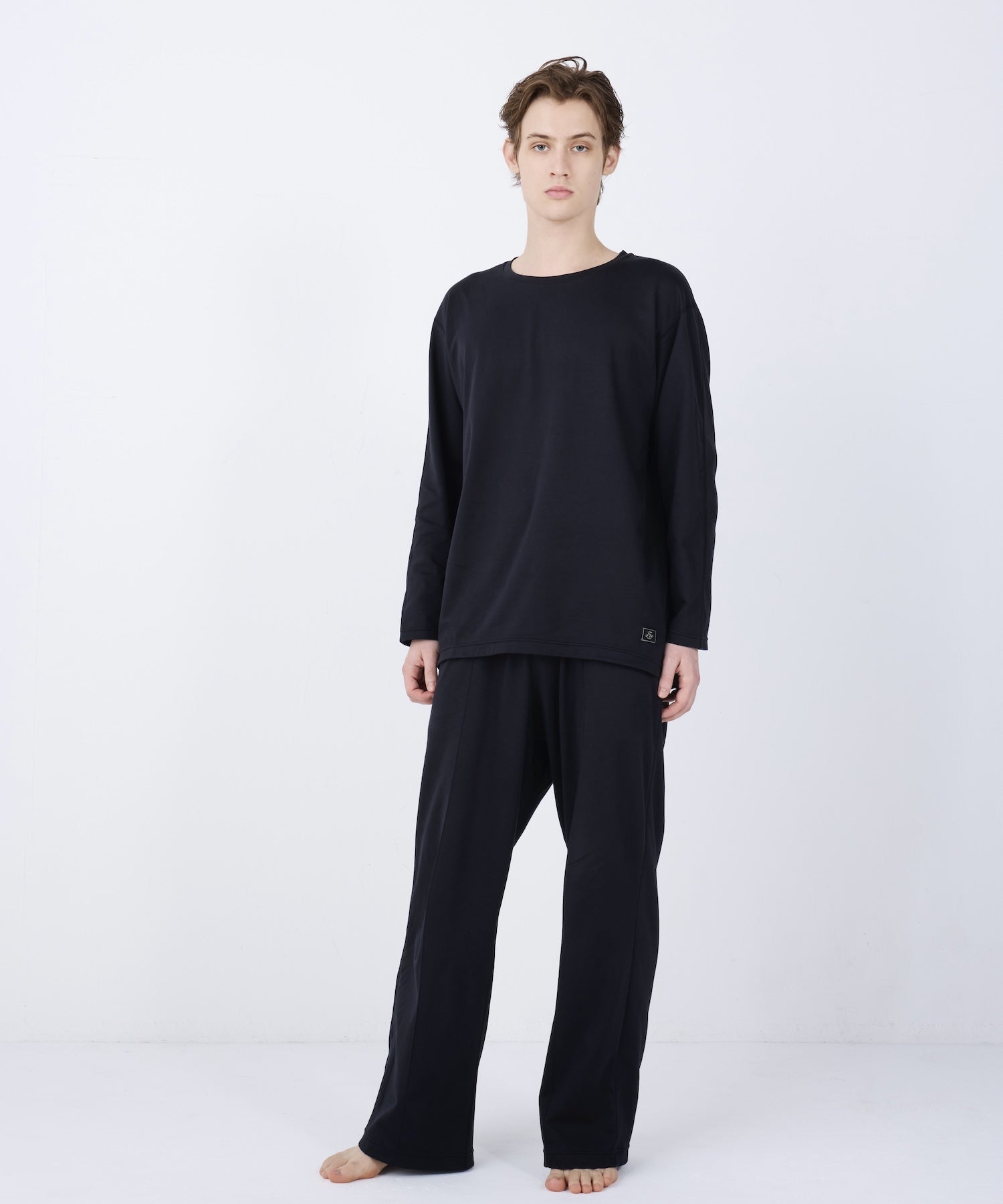 Foo Tokyo独自の配合で生み出した糸を使用。まるでシルクをまとうようなエアリーでとろける肌触り、そして動きを妨げない独自の着用感を実現しました。さらに、「フラットシーマ」という縫製技術を採用することで、生地の縫い目がフラットになり、肌へのゴロつきを解消しました。着心地にこだわった秋冬向けのコットンパジャマです。