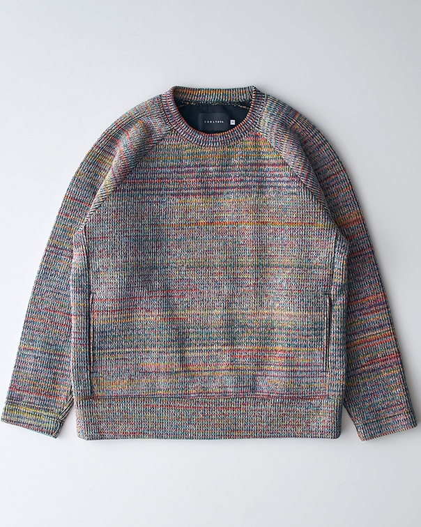 表はコットン、裏はポリエステルで異なるゲージで編まれたクォーターゲージニットを用いたクルーネックプルオーバー。