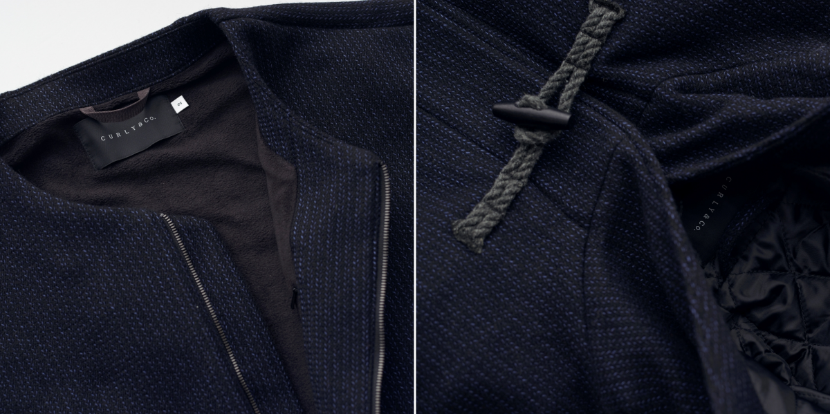 今シーズンの注目素材であるビーチクロス。もともと、20世紀初頭にアメリカ東海岸で誕生したウールとコットンの混紡糸をラッセル編み機で編み立てた生地で、寒冷地の防寒着として使用されていたものです。一般的にはかなり重量感のある素材ですが、CURLY BLACKではその見た目と構造をベースに、サステナブル原料を用いて軽量に再構築しました。