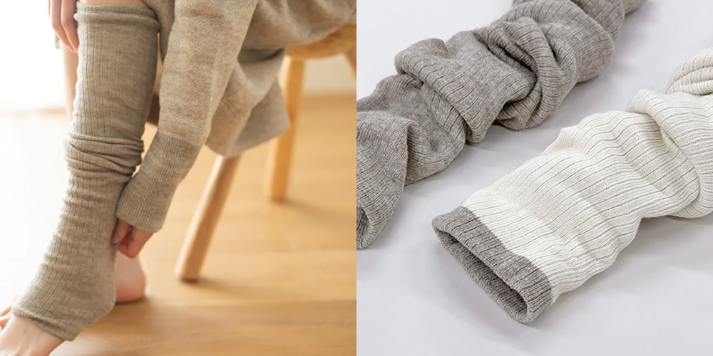 ヤク混糸とオーガニックコットンを重ねた二重構造。足首や腕をそっと温めたい夜にやさしいつけ心地。