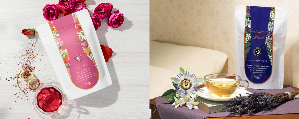 気分転換の一杯にぴったりのハーブティー。華やかな香りのローズブレンドと、落ち着いた香りのパッションフラワーブレンド。