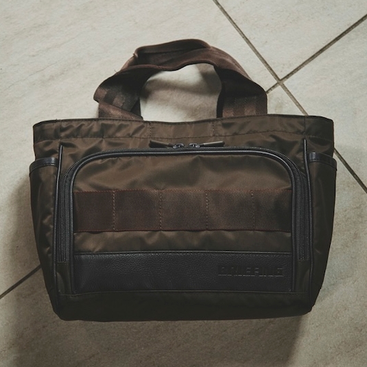 オリジナルのコーデュラ(R)ナイロンツイルをベースにシュリンクレザーのアクセントをプラスした、ラグジュアリーな雰囲気の特別アイテムです。