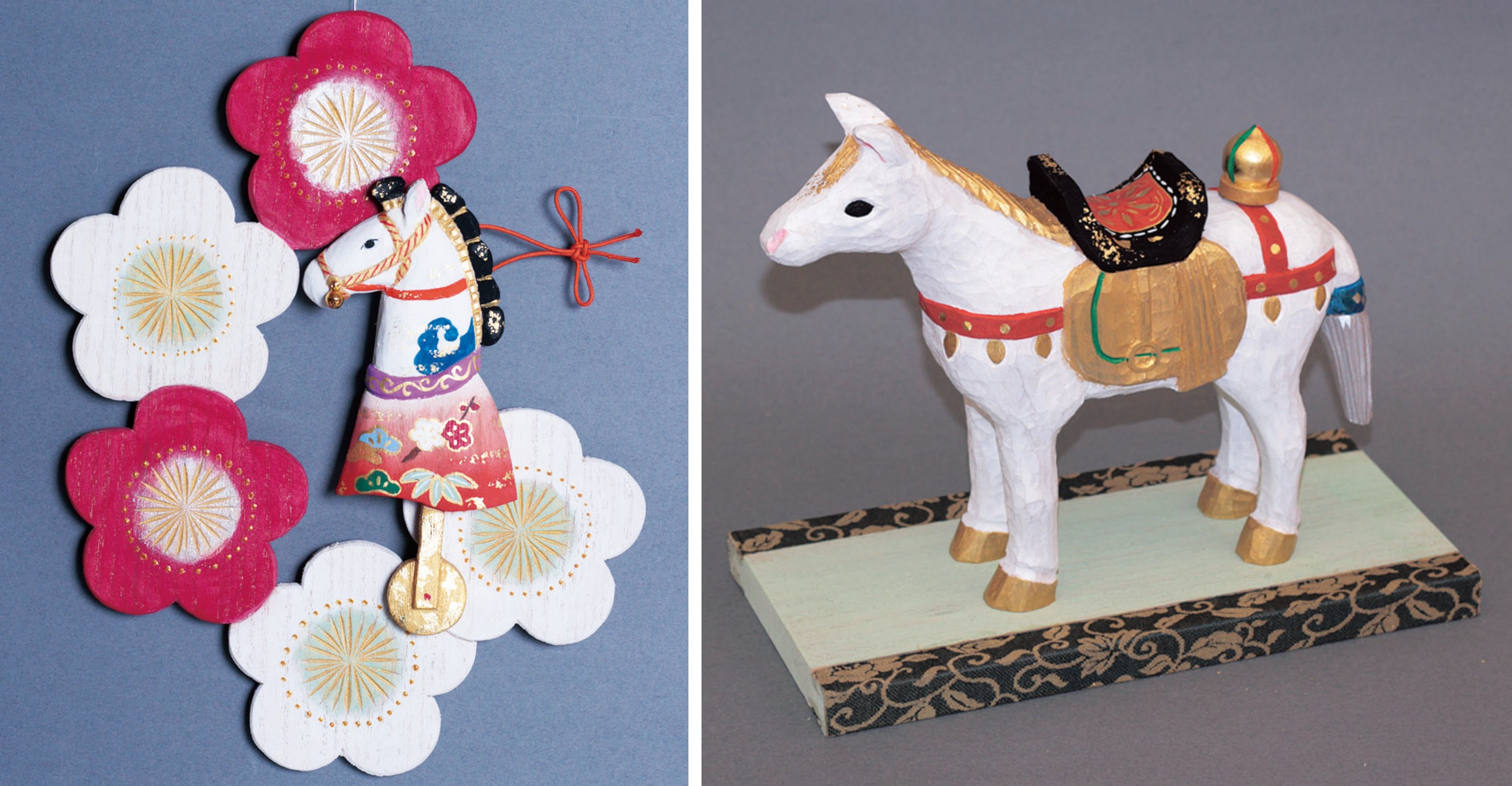 画像左)久保田唯阿 「掛飾り 梅に春駒」66,000円(税込)長辺26cm