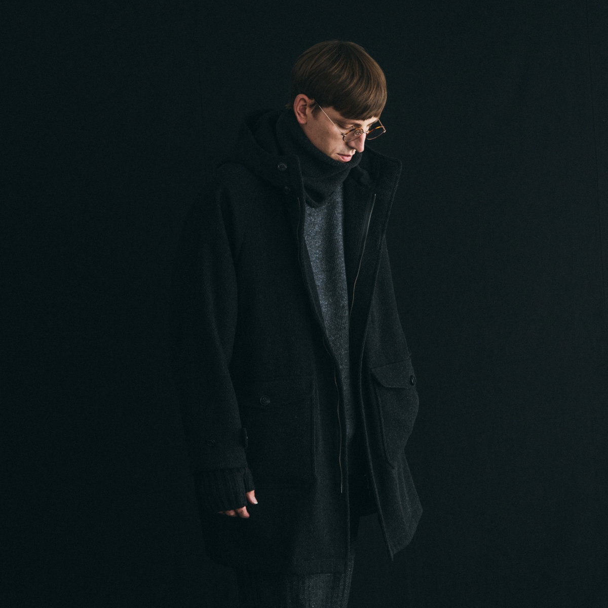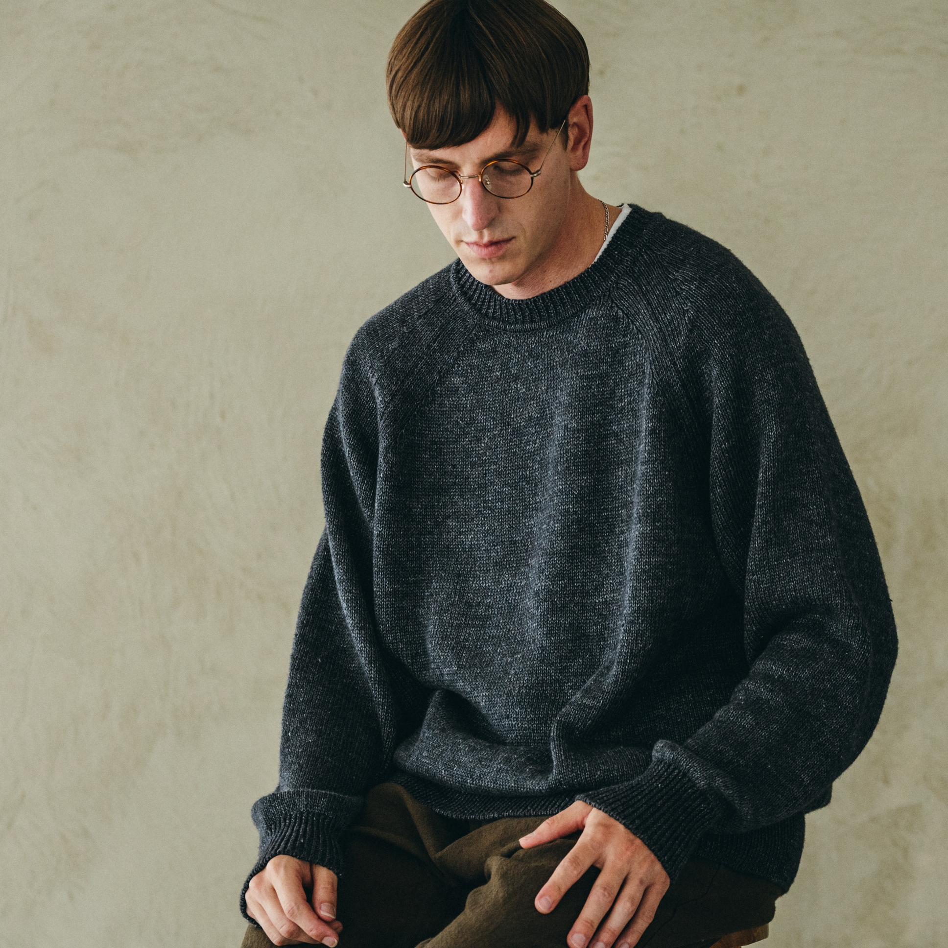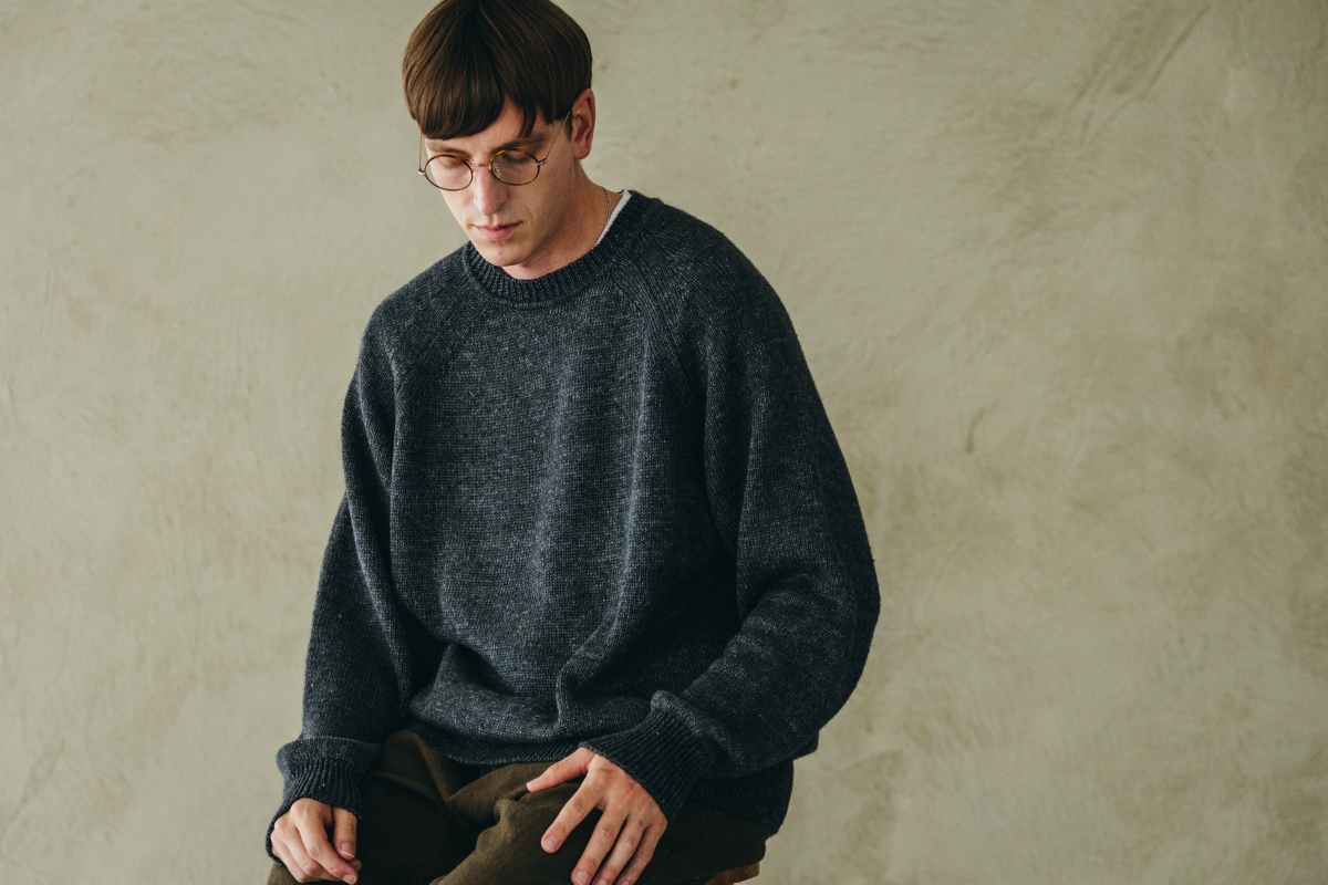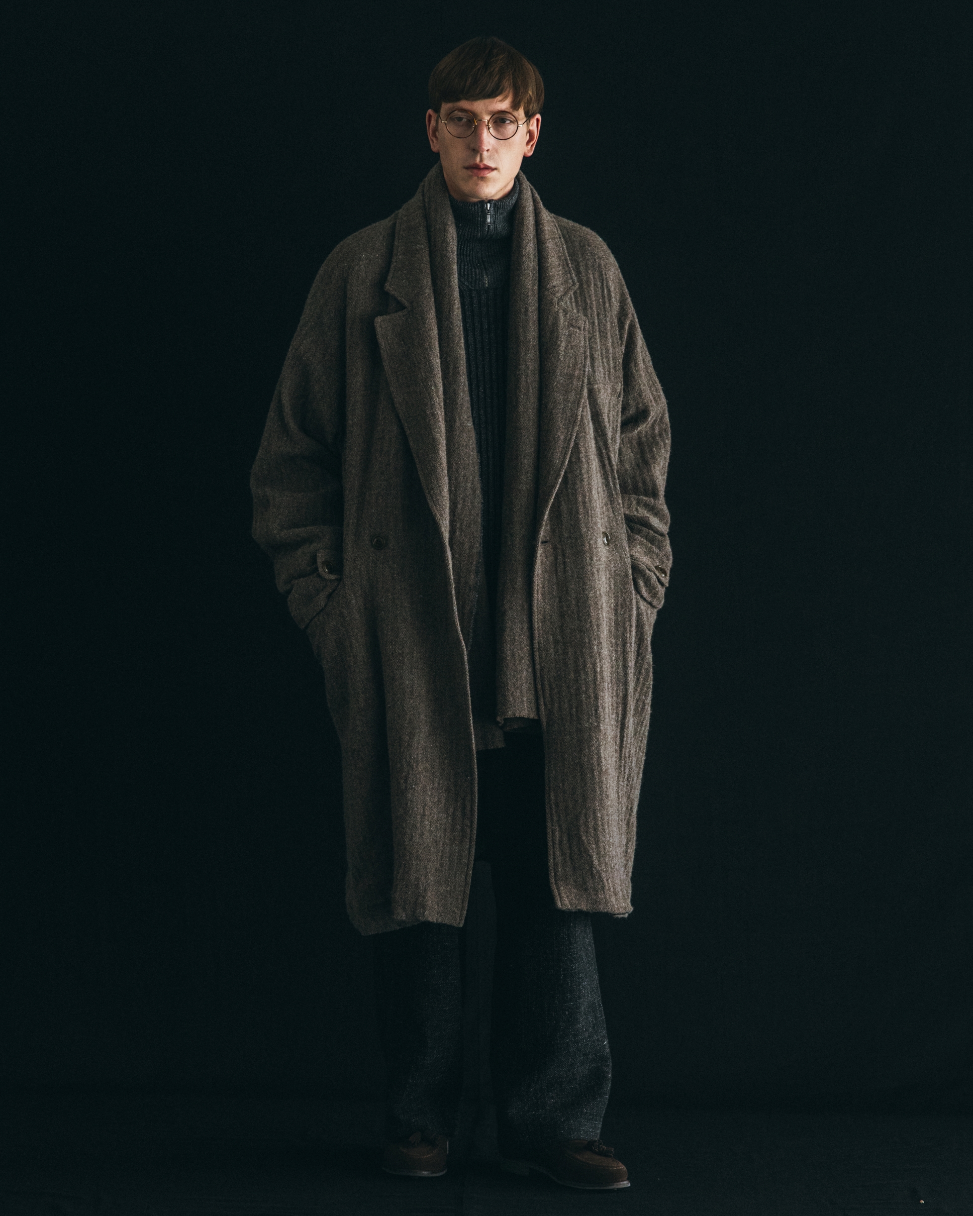今シーズンは、英国羊毛をベースにしながらも、リネン糸をふんだんに織り合わせることで生まれた、柔らかく軽いソフトツイードをオリジナルで製作し、新しいモデルとなるラグランスリーブロングコートをご用意しました。