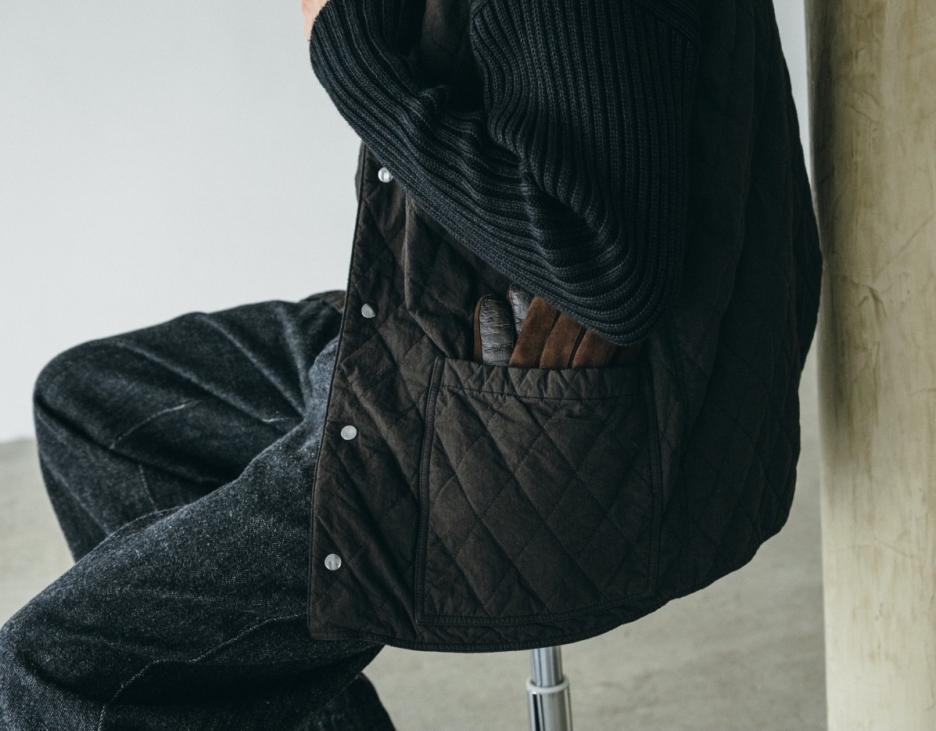 ダブルブレストジャケットとのセットアップや、製品染めによる色表現にも拘ったキルティングリバーシブルベストやジップトップとのコンビネーション使い、またフーデッドコートの裏地にも使用するなど、これまで以上に幅の広いご提案をいたします。