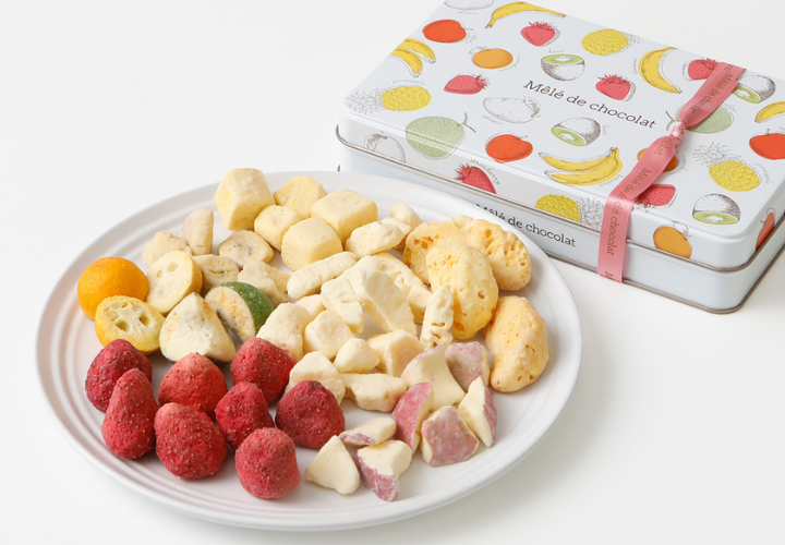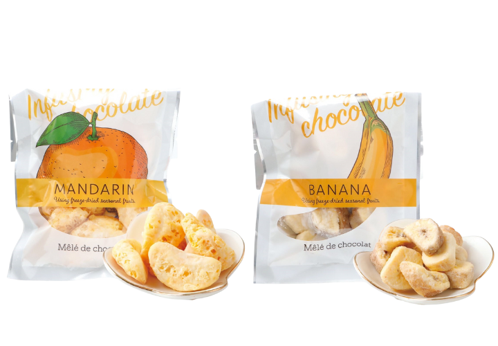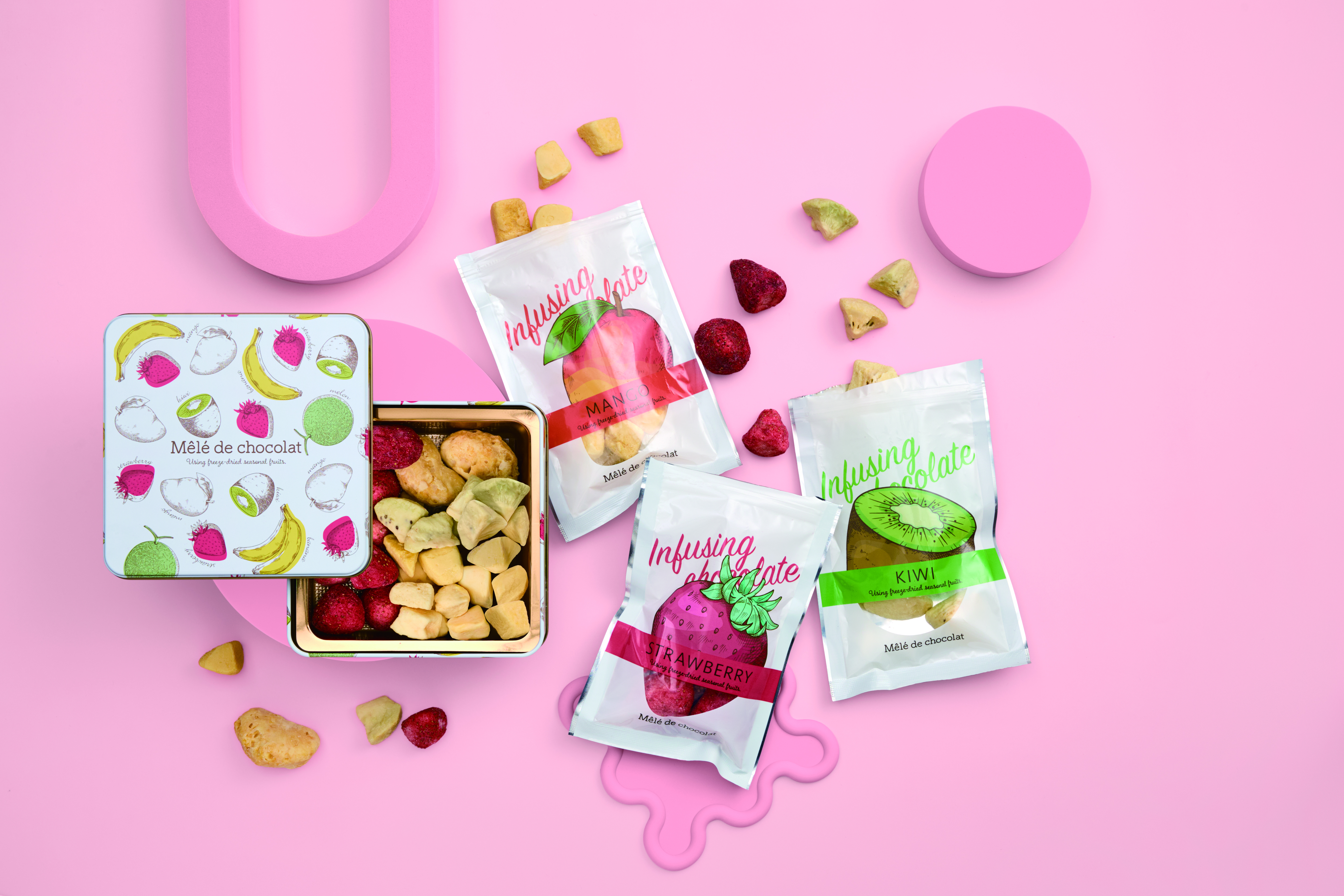 フリーズドライのフルーツにホワイトチョコレートをぎゅっと浸みこませた、しみこみショコラの「メレ・ド・ショコラ」。