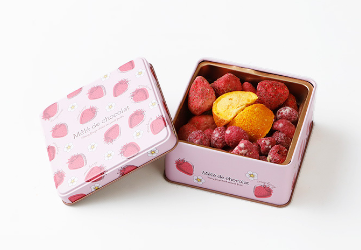 1番人気のストロベリー、甘酸っぱいラズベリーの2種のベリーと、優しい甘さで風味の良い静岡県産 青島みかんをアクセントにアソートしました。いちごのイラストが可愛いピンクの缶はプレゼントにおすすめです。