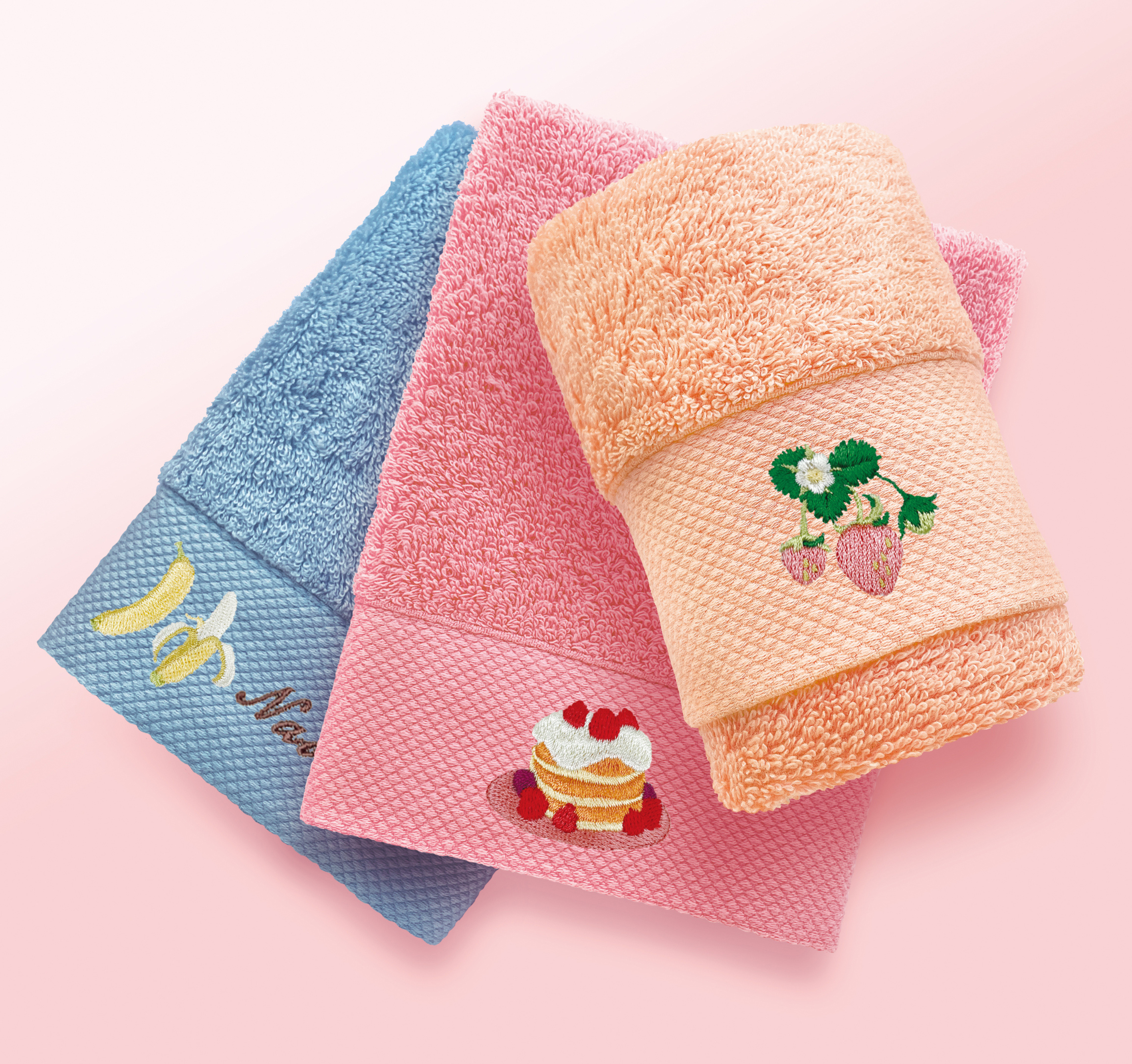 フルーツ柄のモチーフ刺繍や、イニシャル・ネーム刺繍を組み合わせて、自分だけの一枚を仕立てられます。ギフトにも、自分用にもおすすめです。