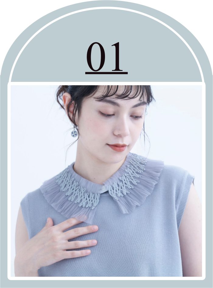 顔まわりがパッと華やぐ、心ときめくチュールの魔法。繊細な2重チュールをたっぷり使い、ヨーロッパのクラシカルな気品を纏える一枚。プリーツの立体感がいつものスタイルを格上げします。