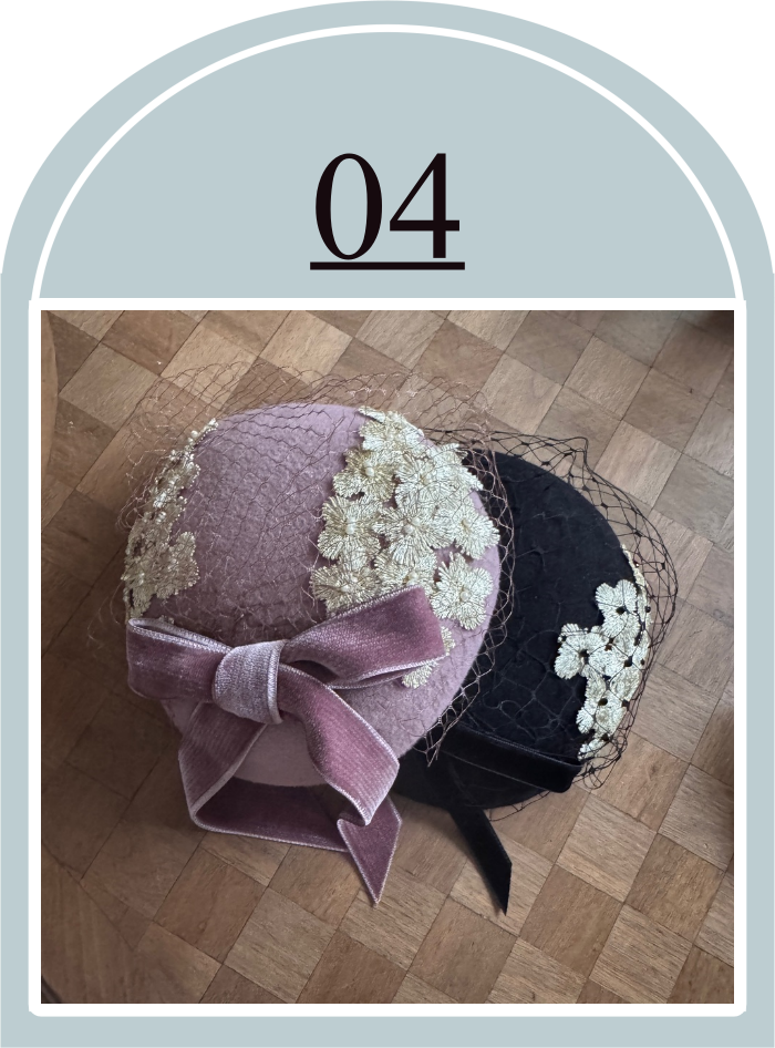 金糸の立体的な花刺繍をあしらった帽子。繊細なベールとベルベットリボンが、顔まわりにクラシカルで華やかな陰影を添えます。ラベンダーピンクは柔らかく可憐に、ブラックは洗練された印象に。