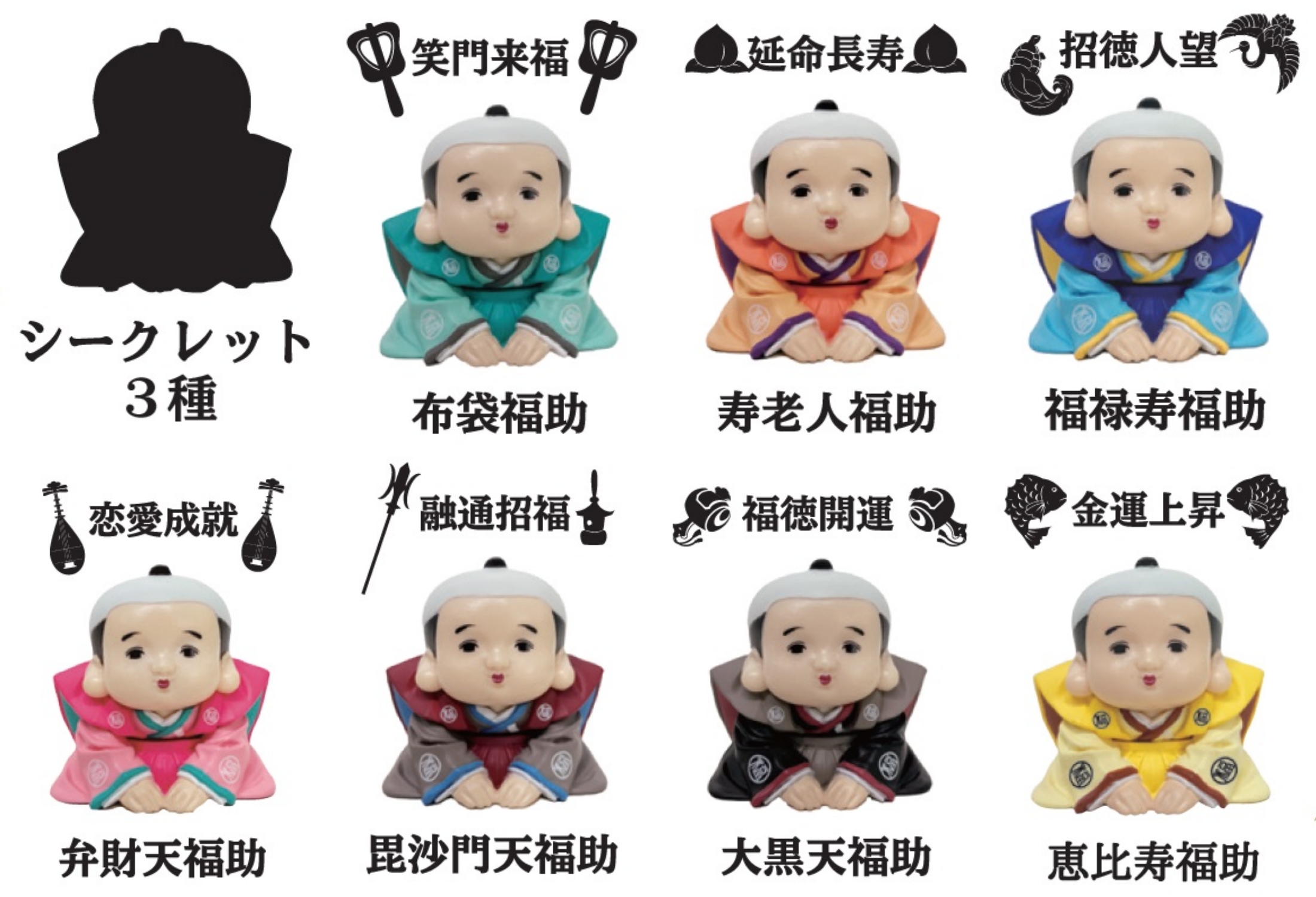 福徳の神として日本で信仰される七福神をイメージした7種の福助人形に加え、レアなシークレット3種、全10種。