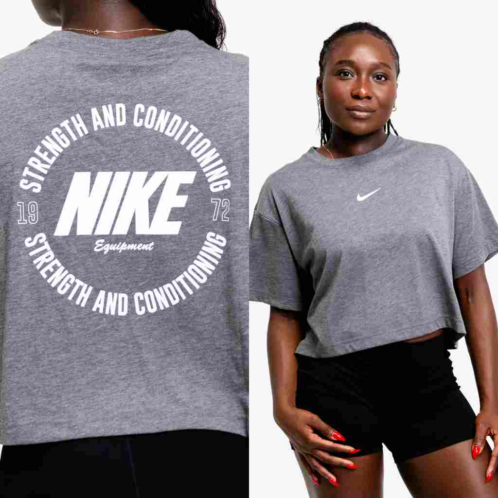 NIKE STRENGTHブランドロゴバックプリントウィメンズクロップドクルー。