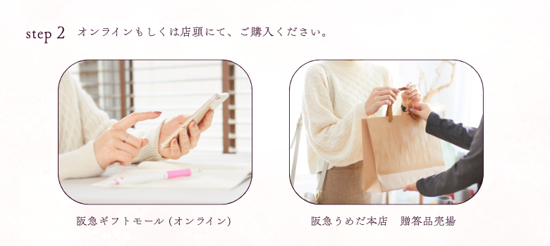 「阪急ギフトモール」でのオンラインのご注文に加え、阪急うめだ本店の店頭でもご購入いただけます。(ご配送 / お持ち帰り 共に対応可能)