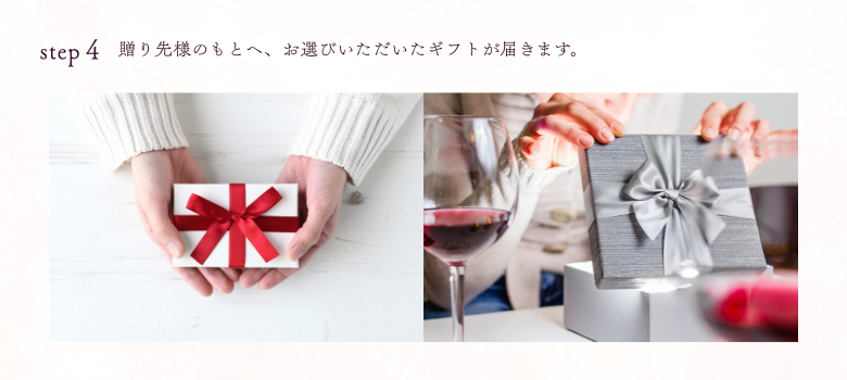 ハガキ到着後またはWEBサイトからのお申し込み受付後約2週間で、お選びいただいたギフトを贈り先様のもとへお届けいたします。
