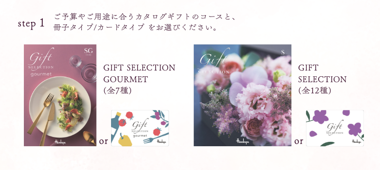 阪急のカタログギフト「GIFT SELECTION GOURMET(全7種)」「GIFT SELECTION(全12種)」は全コース、冊子タイプ / カードタイプ の2種類がございます。