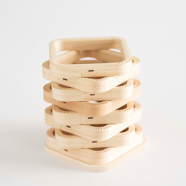 日本遺産に登録された製作技術で桧の一枚板を曲げて井桁積みにしたコンパクトなタワー。お花の一輪挿し、ペン立て、スプレーカバーなどにお使いいただけます。