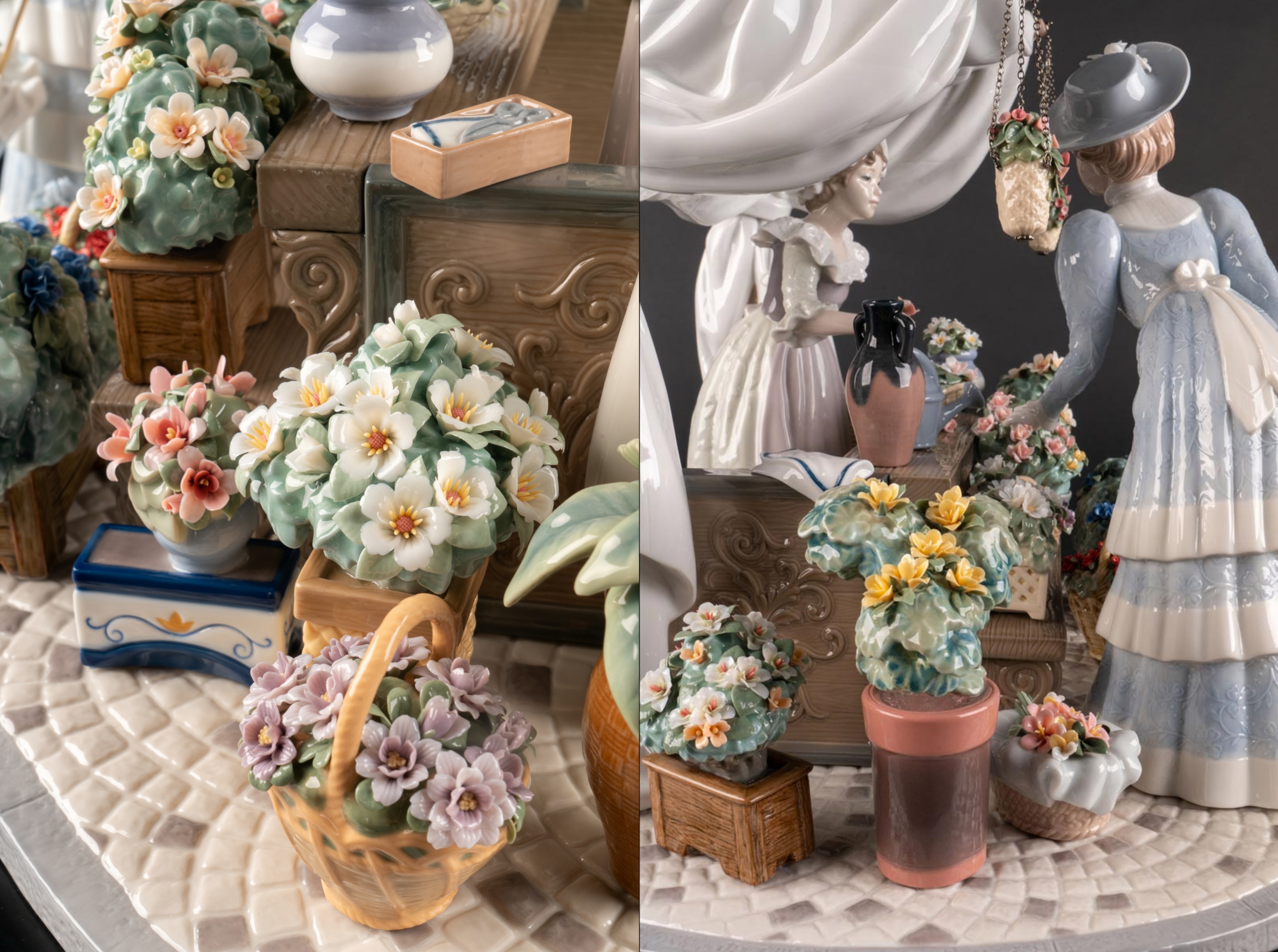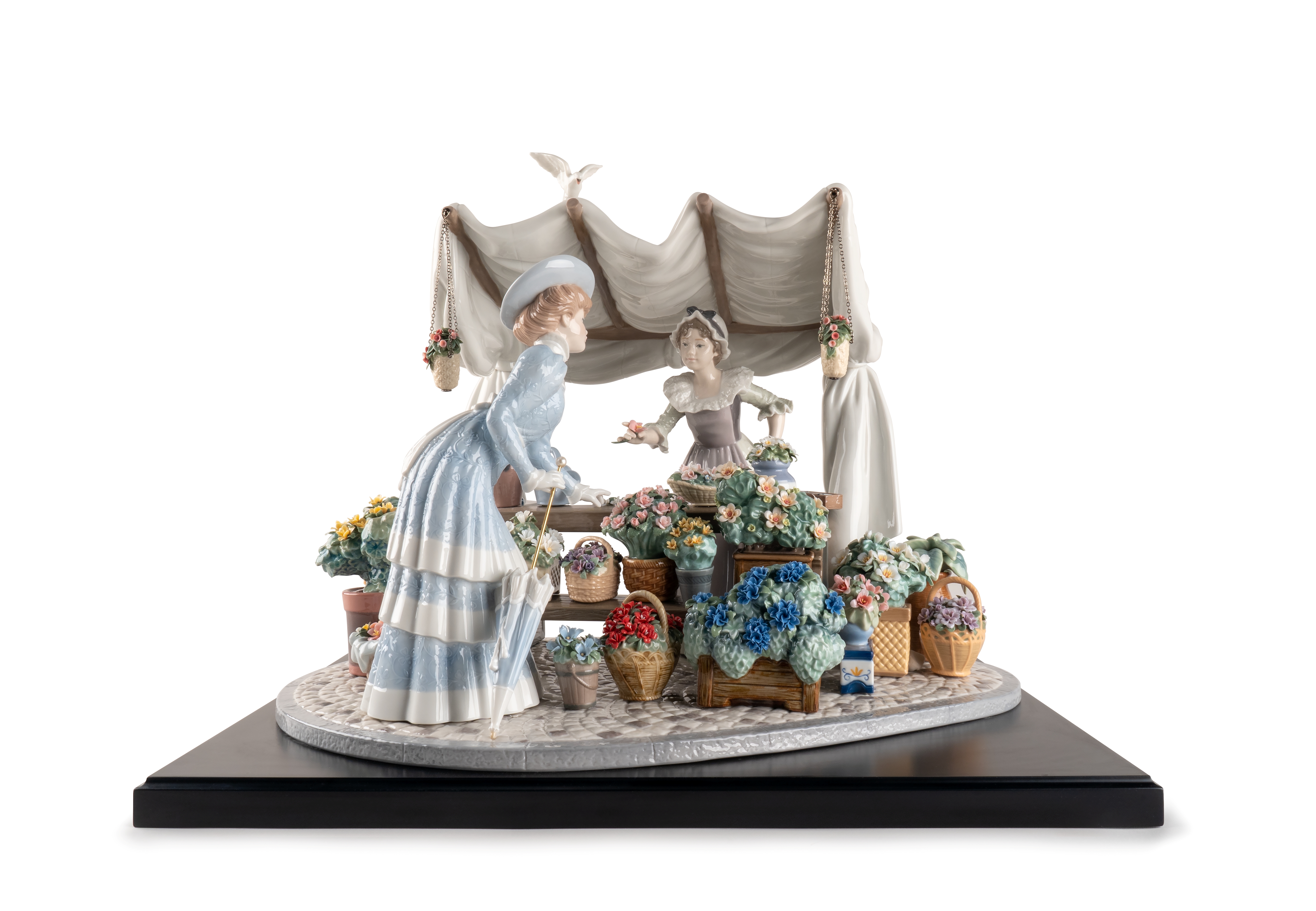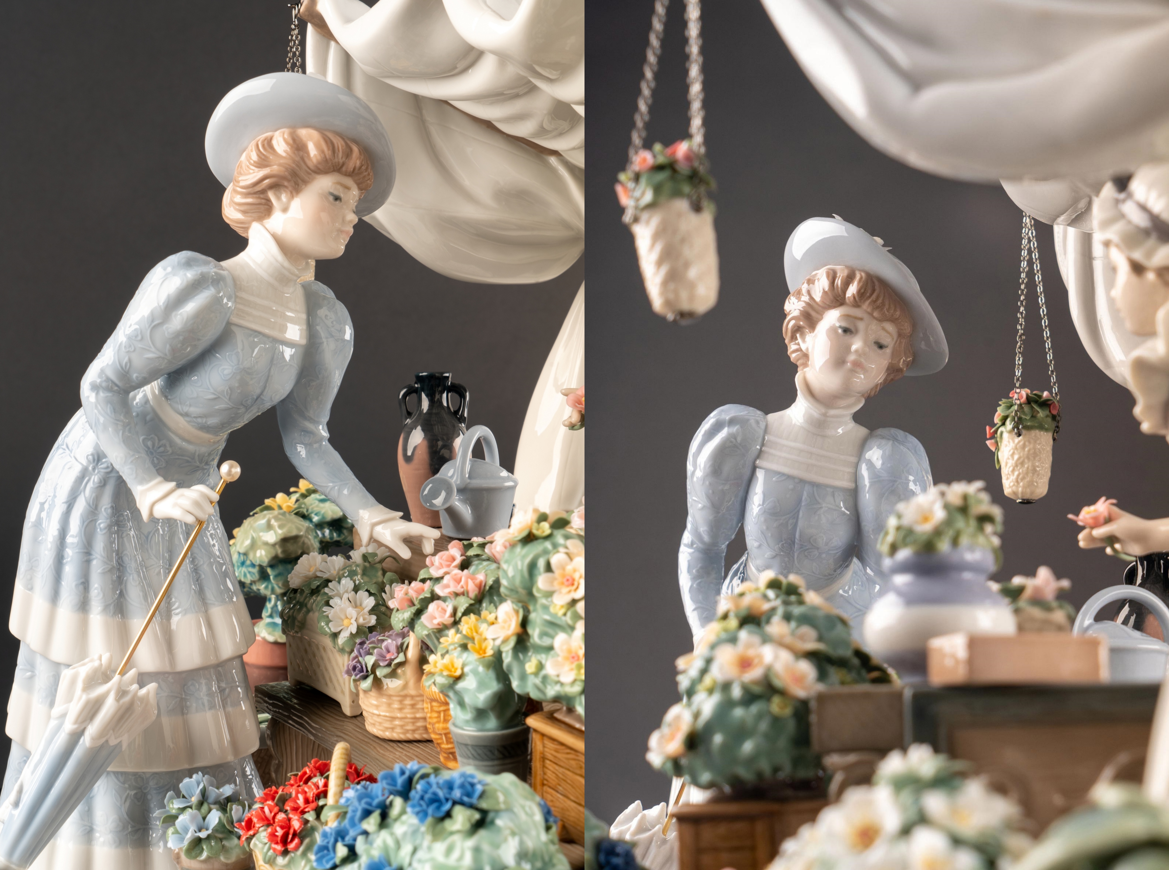 この作品では当時の典型的なシーンが再現され、19世紀の牧歌的なロマン主義の世界へと私たちを誘います。女性のドレスの刺繍やレース、そして布の色は彫刻家と装飾チームの丹念な作業とこだわりにより再現されています。そして、様々な種類の色と色調が組み合わされた見事な装飾によってさらに豪華さを増しています。